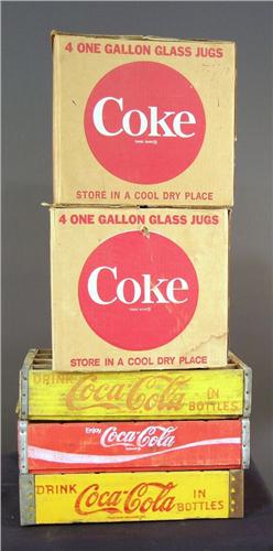 2 cases of 4, 1 gal "Coke" syrup bottles & 3 wooden carrier cases