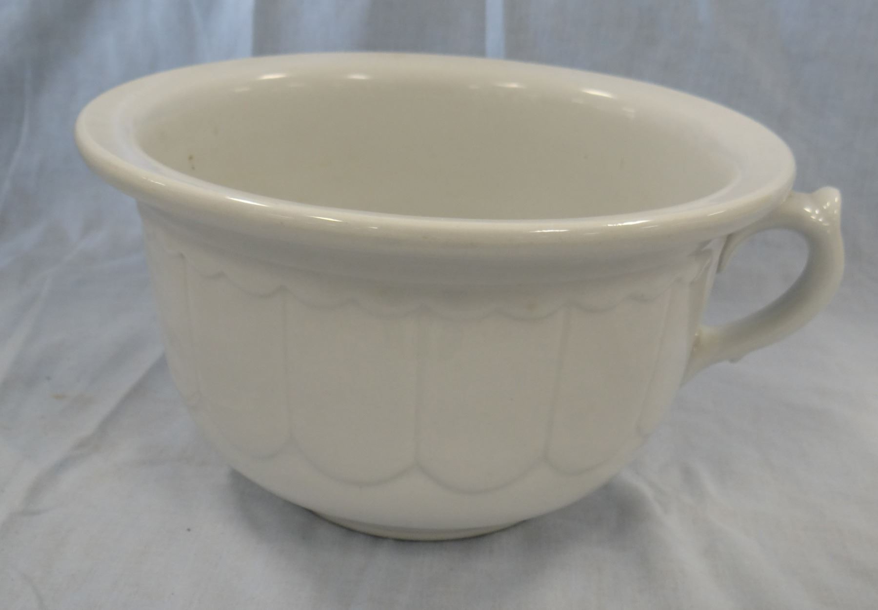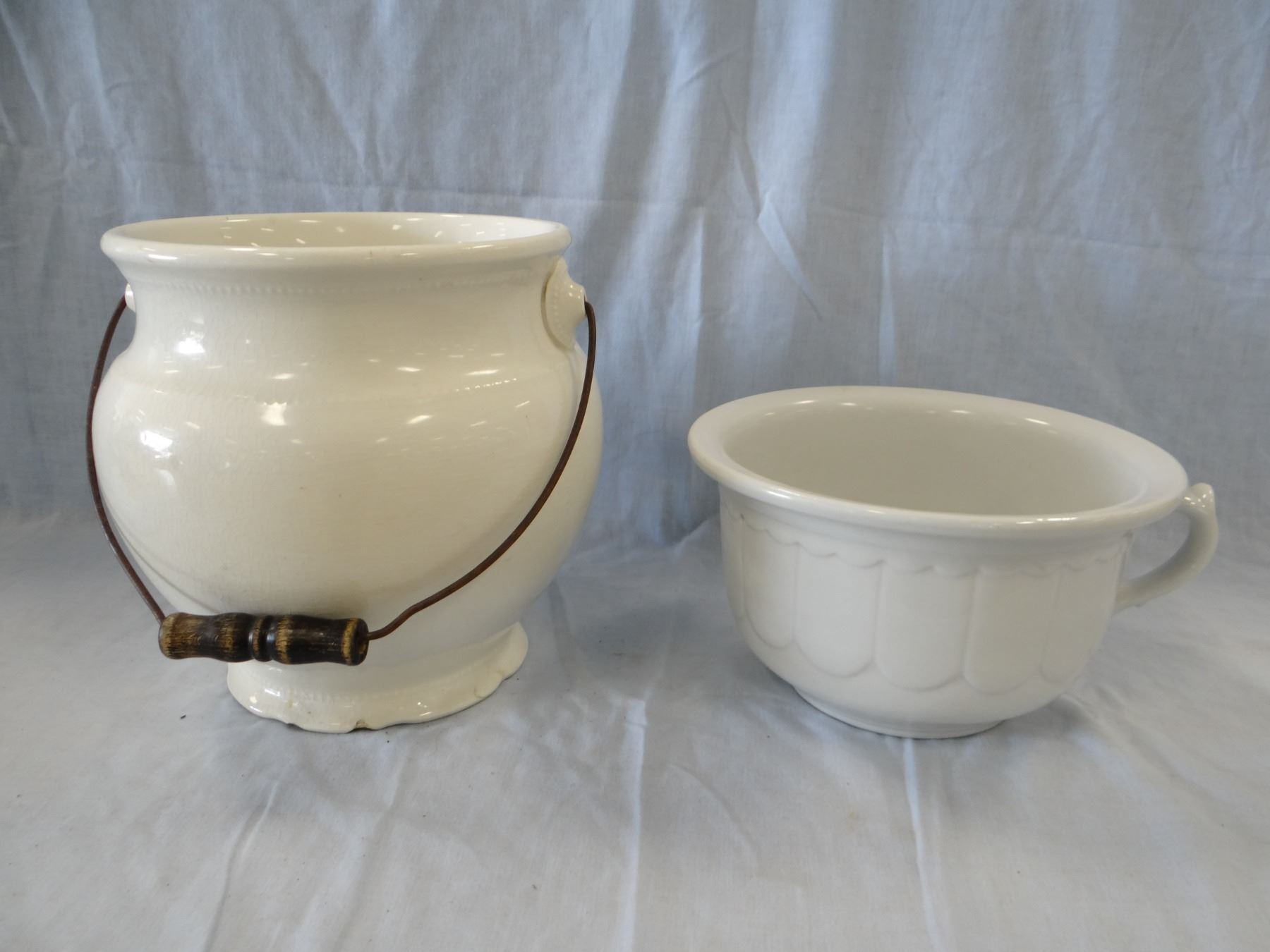 (2) chamber pots: one by W.S. George, bucket style with metal/wood handle and one mark unreadable wi