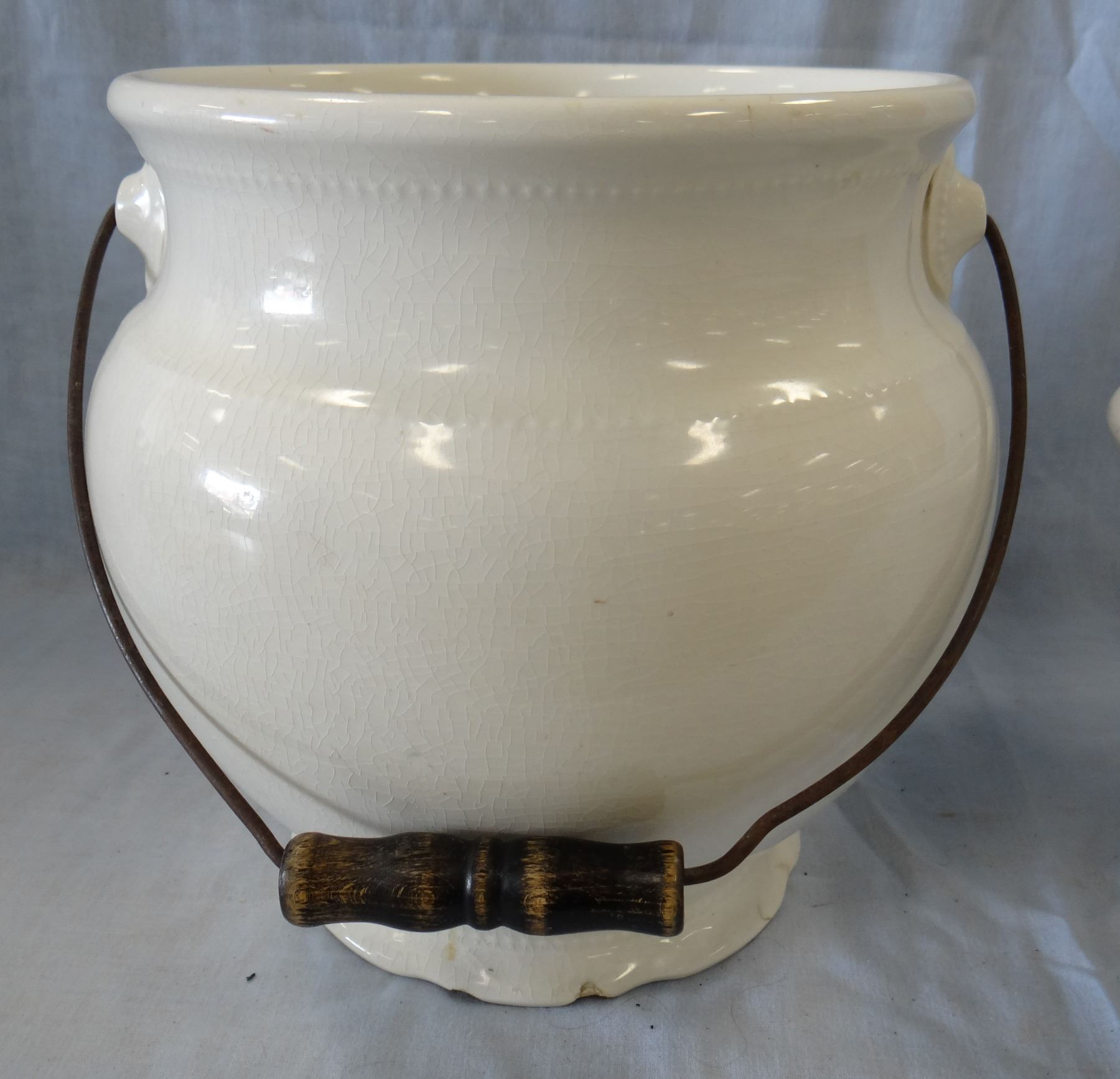 (2) chamber pots: one by W.S. George, bucket style with metal/wood handle and one mark unreadable with side handle