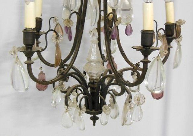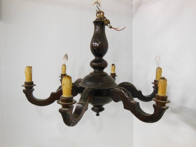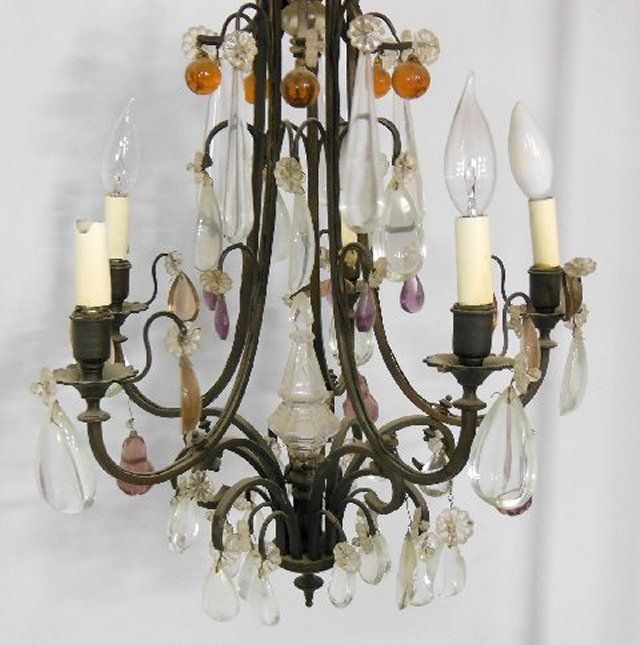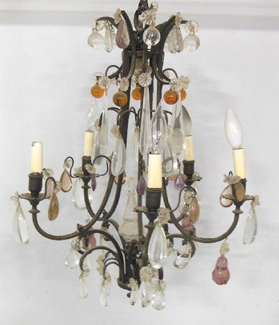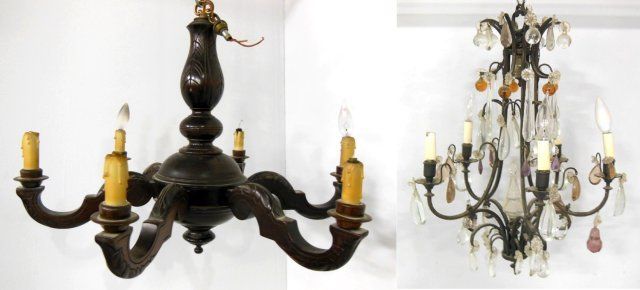 1- Vintage cage form chandelier with colored prisms. 1- Wood chandelier.