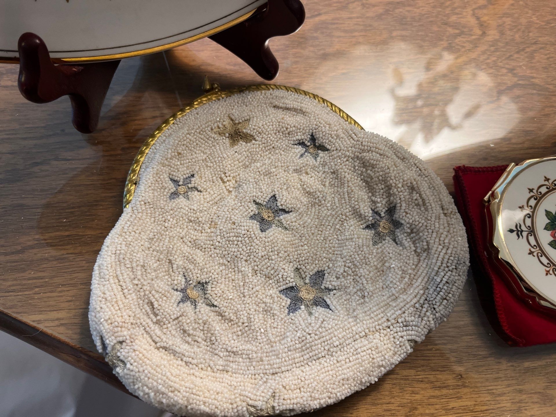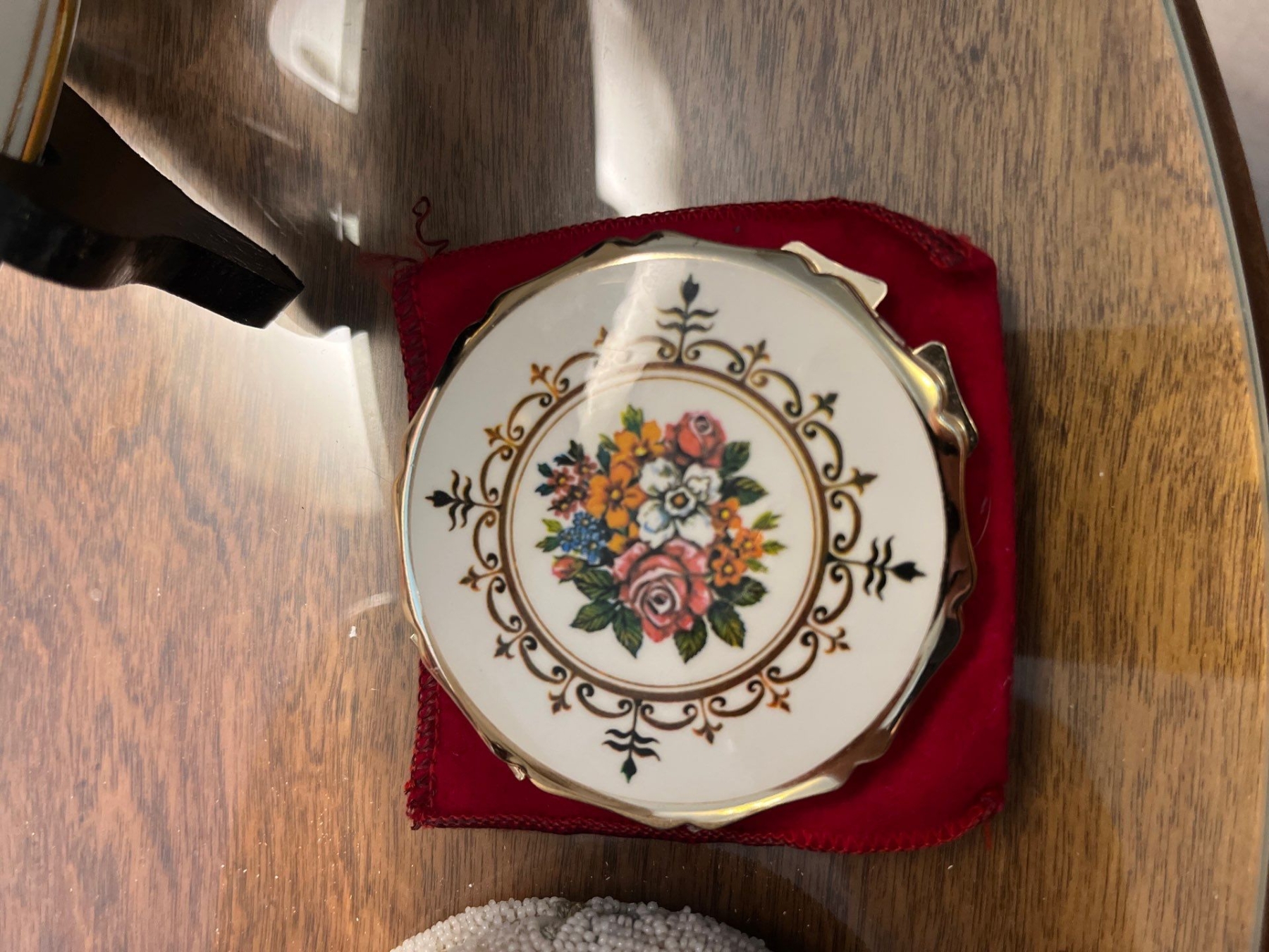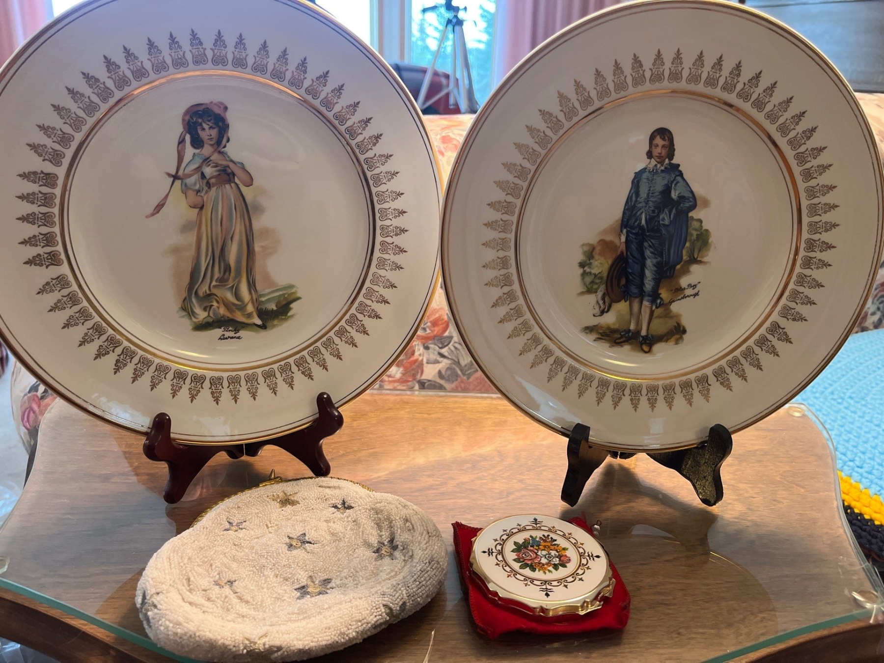 2 collector plates made by wood and Sons in England blue boy and pinky lorance . Along with a beaded clutch and makeup Compaq made in Japan