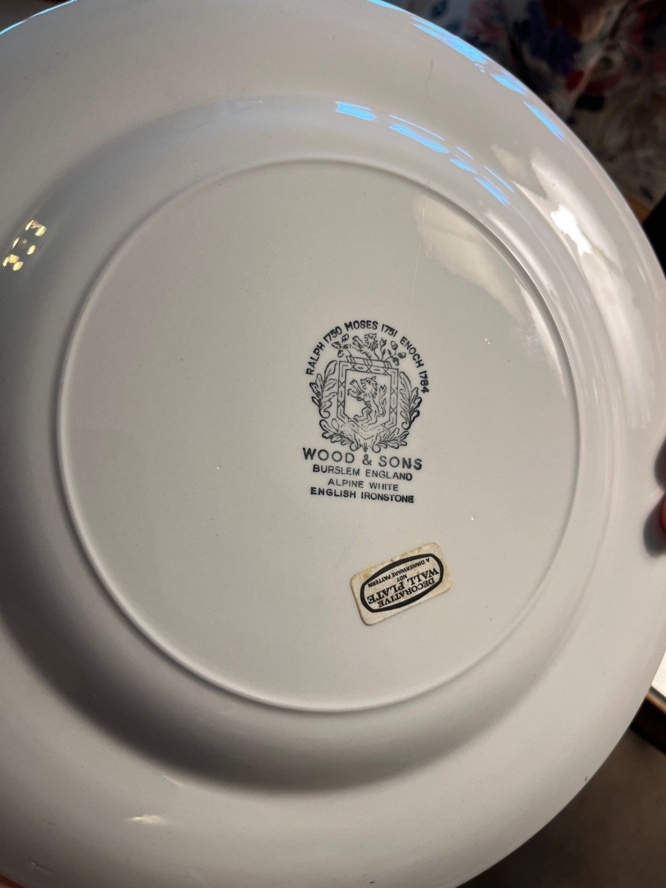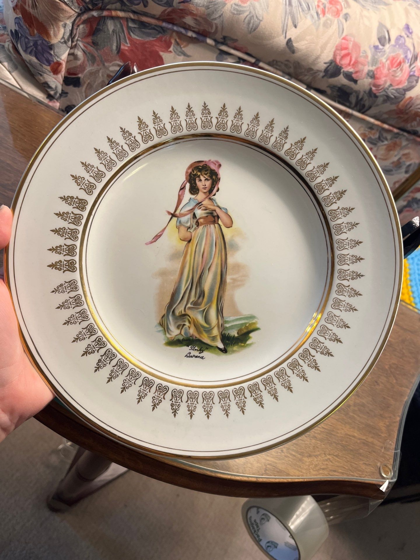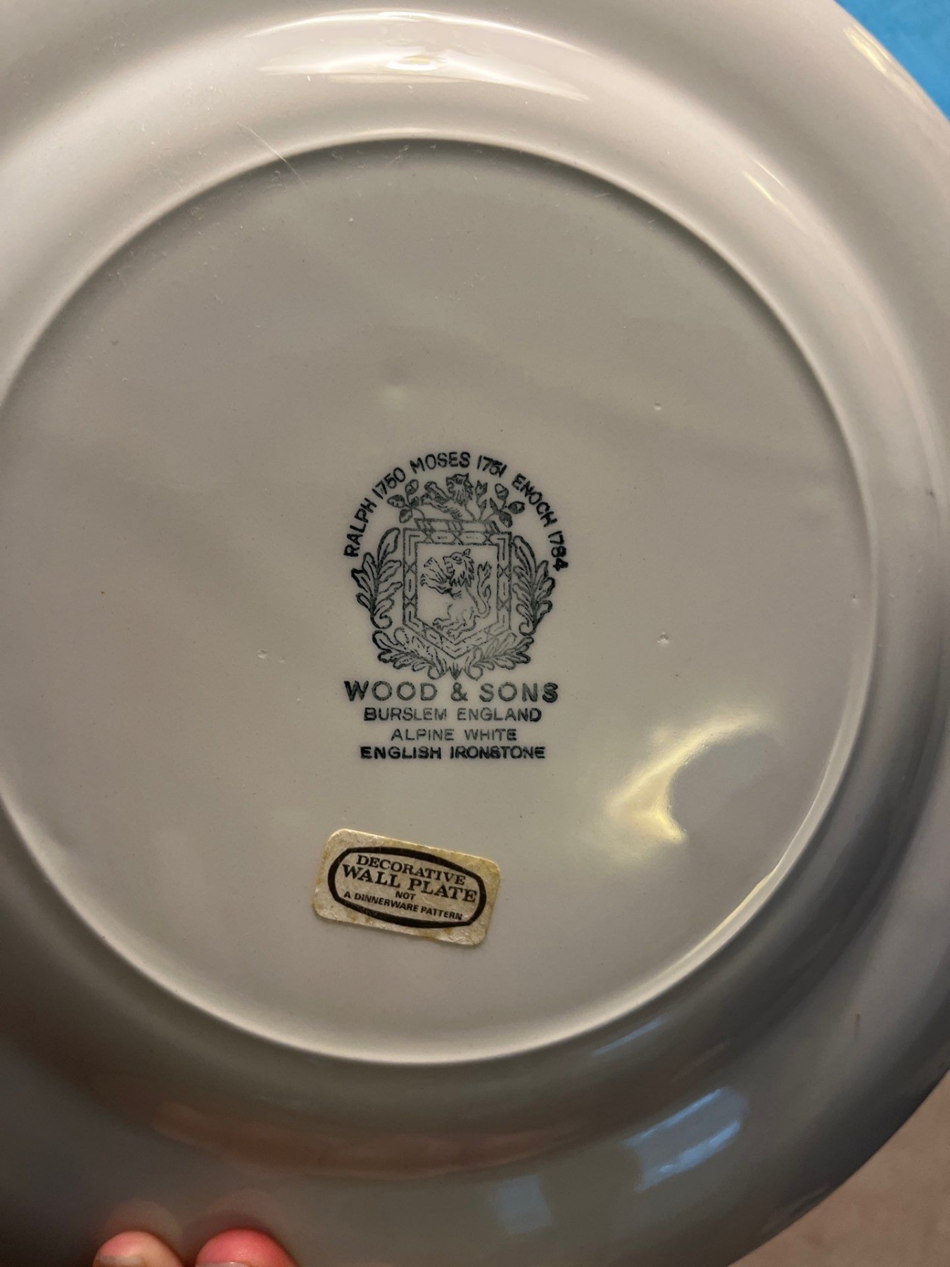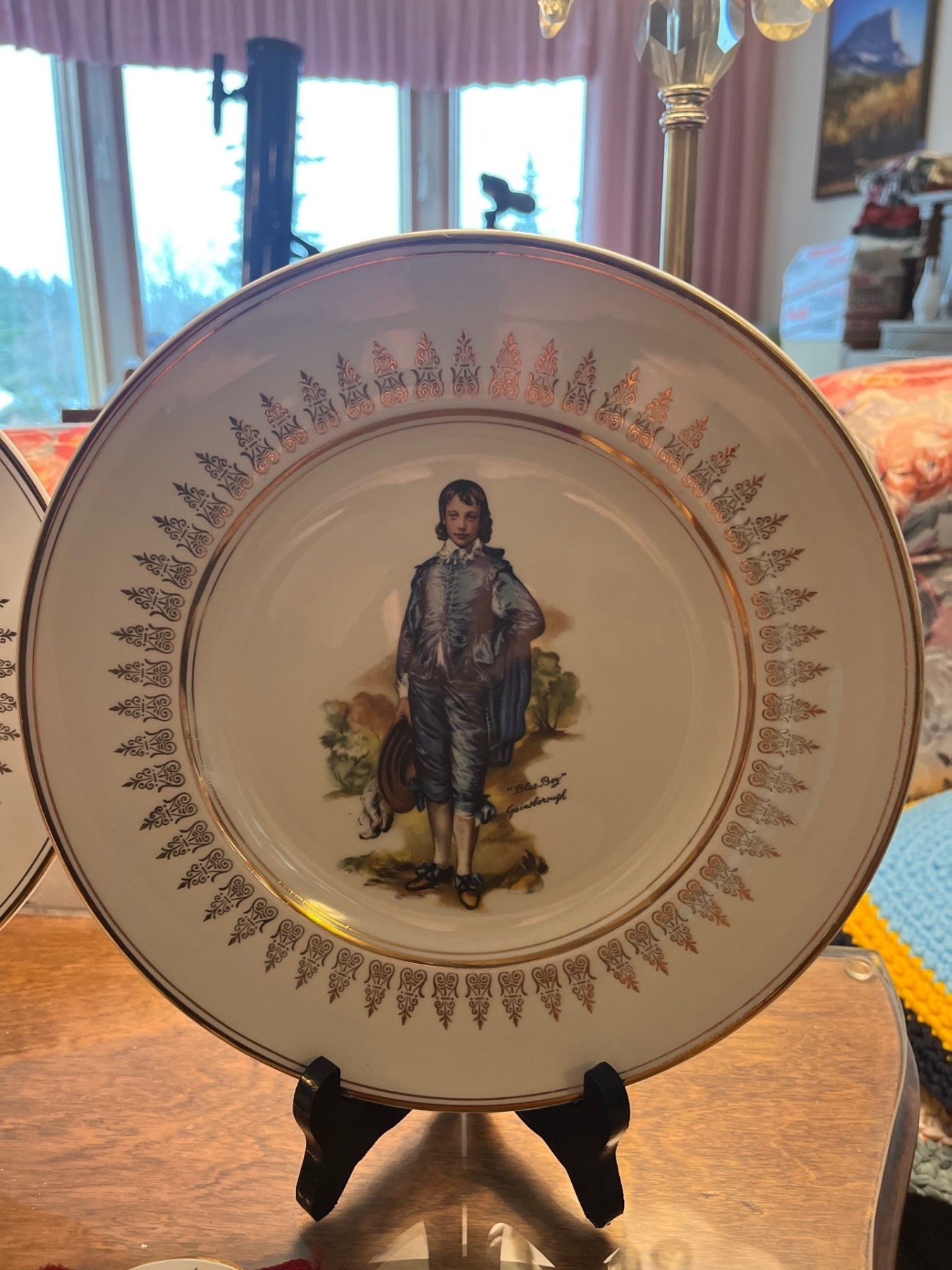 2 collector plates made by wood and Sons in England blue boy and pinky lorance . Along with a beaded clutch and makeup Compaq made in Japan