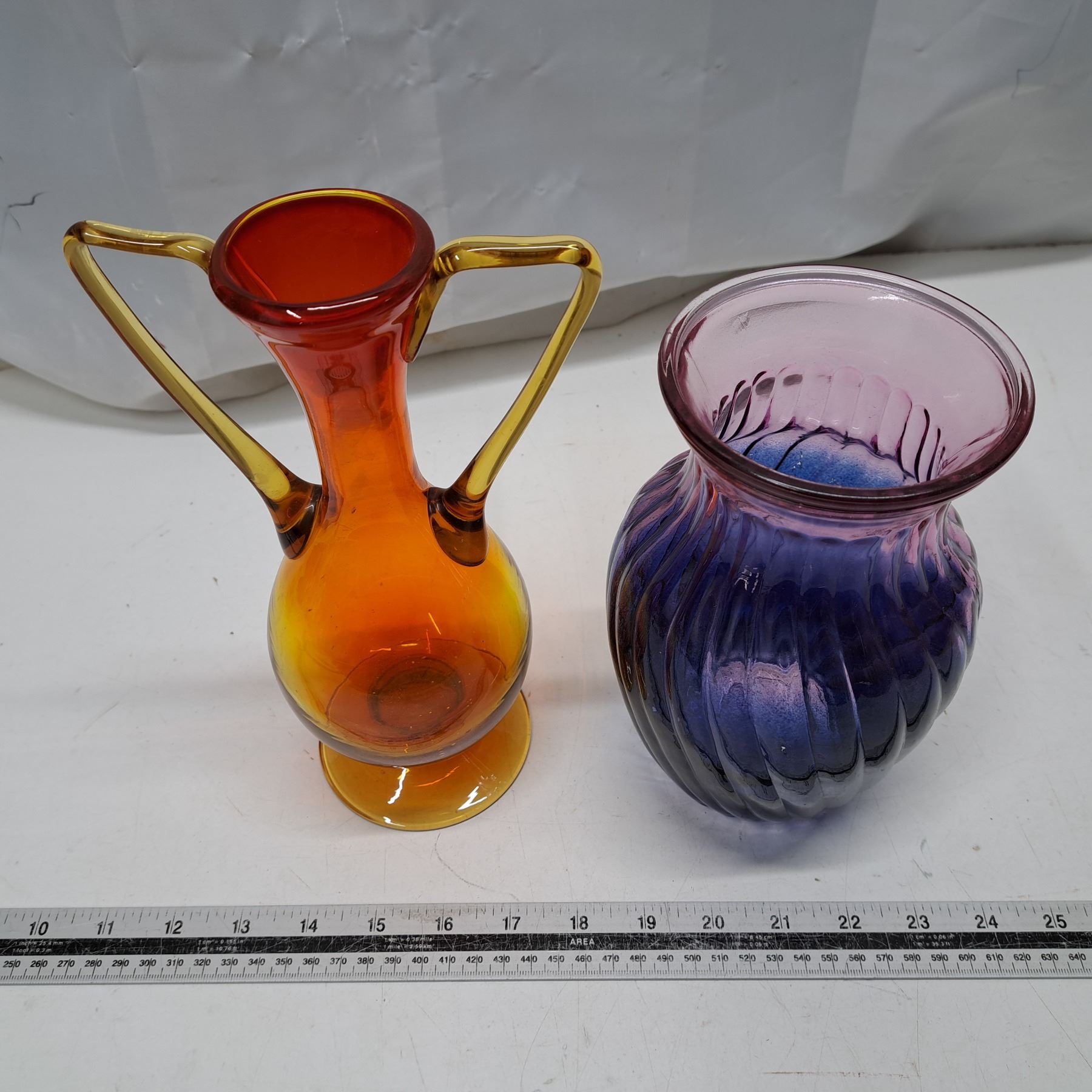 2 coloured glasss vases