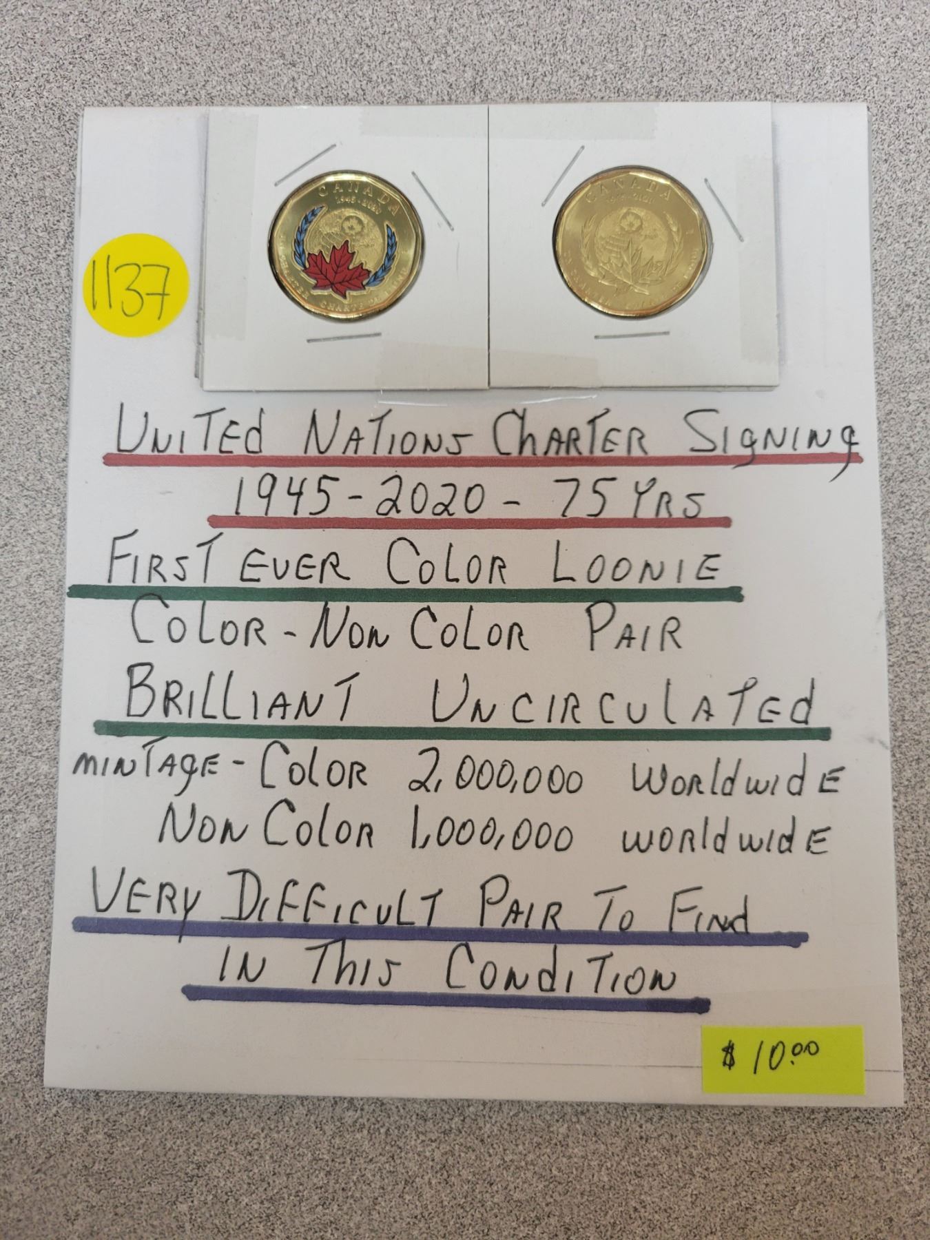 2 commemorative Canadian loonies - United Nations Charter Signing 1945-2020 first ever color loonie BU
