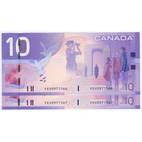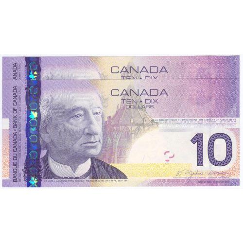 Bank of Canada, 2 consecutive $10.00 Insert notes 2004, grade Choice to Gem UNC, Charlton # BC-68aA-i, signature Jenkins Dodge, serial FEV0971566-67, insert range 0.360M - 1.035M. Problem free note.