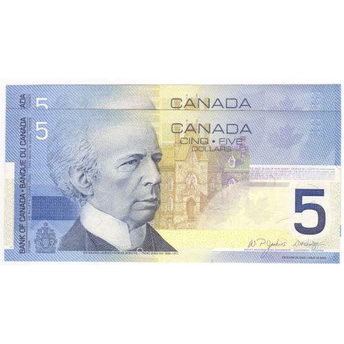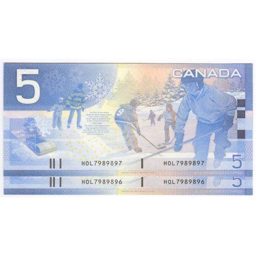 Bank of Canada, 2 consecutive $5.00 Insert notes 2005 (Radar insert + notes insert before), grade UNC, Charlton # BC-62bA, signature Jenkins Dodge, serial HOL7989896-97, insert range 7.840M - 8.000M. Lot includes the radar and 1 note before.