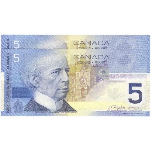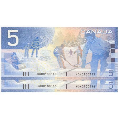 Bank of Canada, 2 consecutive $5.00 Changeover notes 2004, grade Gem UNC, Charlton # BC-62b, signature Jenkins Dodge, serial HOH0100315-16. Problem free notes undervalued at present time.