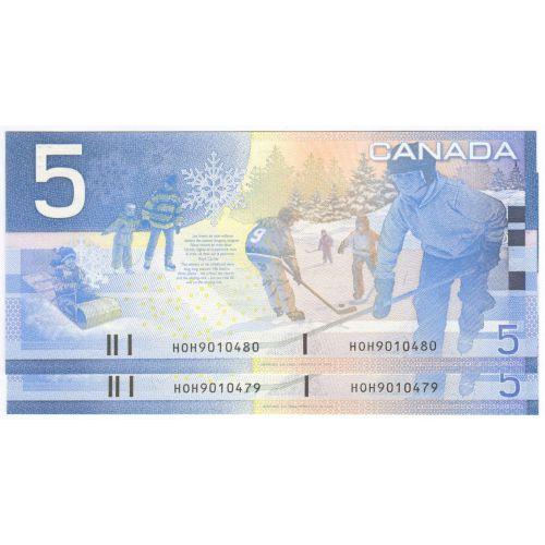 Bank of Canada, 2 consecutive $5.00 Insert notes 2005, grade Choice to Gem UNC, Charlton # BC-62bA, signature Jenkins Dodge, serial HOH9010479-80, insert range 9.000M - 9.060M. Problem free notes.