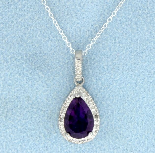 Contains 2 ct Pear Shaped Genuine Amethyst gemstone and two .01 ct Diamonds. Set in platinum over sterling silver, on an 18 inch chain. 2.1g.