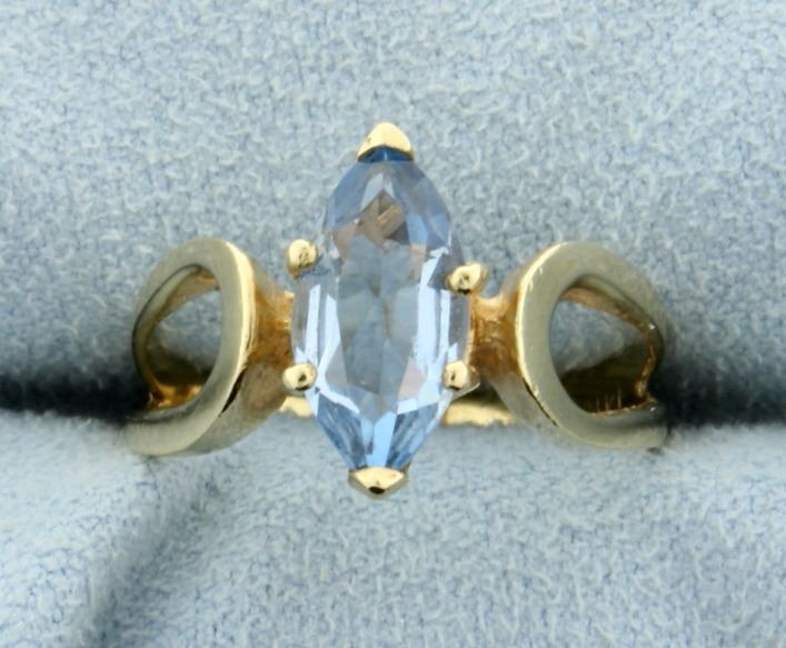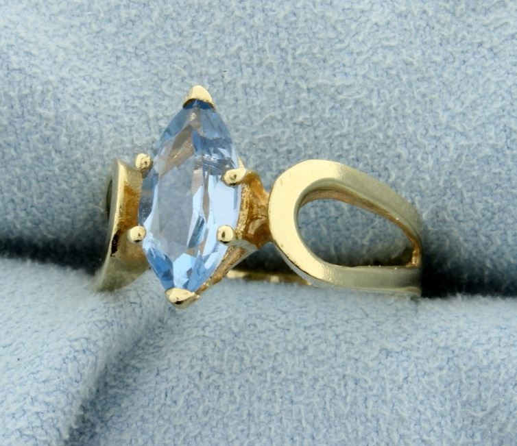 In 14k yellow gold this ring has a 6x10mm marquise cut blue topaz. Size 7 1/2 3.1g