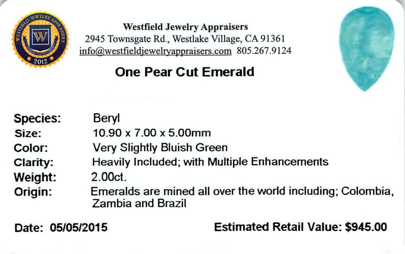 One pear cut natural emerald, measuring 10.90 x 7.00 x 5.00mm, exact weight 2.00ct., clarity is moderately included, type III, medium light, very slightly grayish, very slightly bluish green color, (GIA vslbG 4/3)_x000D_ Westfield Appraised.