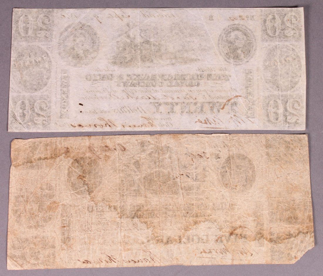 [Chesapeake & Ohio Canal]. 2 Notes, for $20 and $5. Text reads ?The Chesapeake & Ohio Canal Company Promise to pay on Demand at their Office at Frederick, Maryland to Jacob Marshall or bearer?? ??Twenty?,? ?? Five?? dollars with Interest from date.? (Marshall?s name is handwritten, remainder of text printed.) Text is flanked on 3 sides by engraved decorations. In left portion of each note: ?Danforth, Underwood & Co. New York.? In right portion: ?Underwood, Bald, Spencer & Huffy, Philada.? $20 note is dated ?Sept 9 181,0?. $5 note is ?Octr 9 181,0?. Serial numbers handwritten at upper left (?262? and ?300?). Both are signed ?Francis Thomas? and by a clerk.