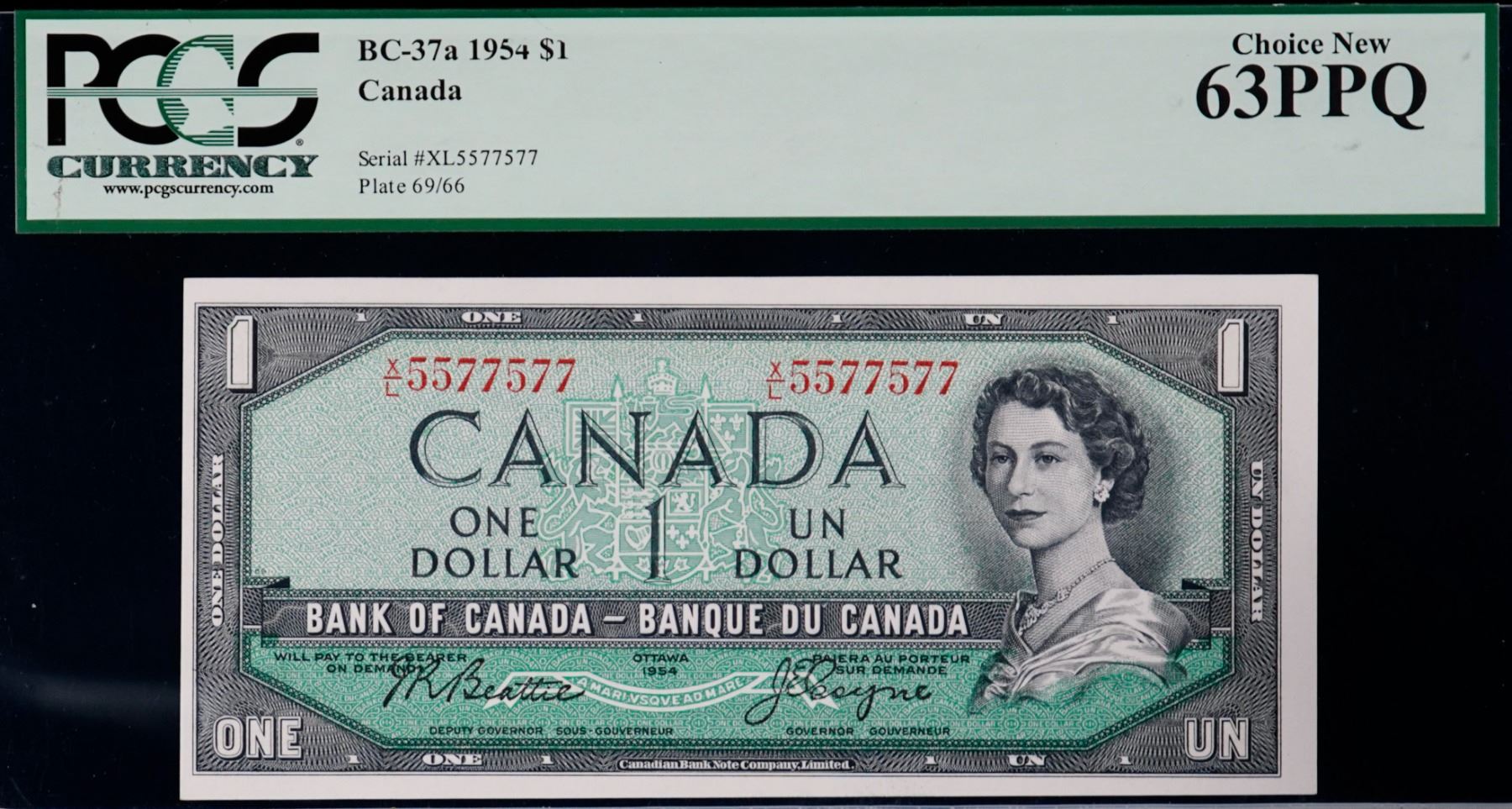 2-digit; 1954 $1 BC-37a #X/L 5577577 PCGS 63 PPQ
