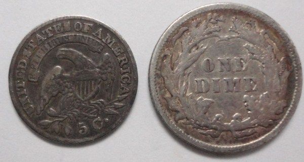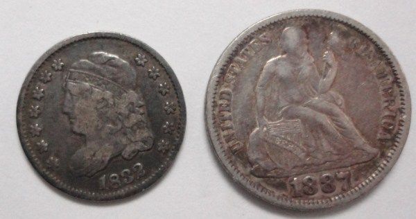 2 early type coins, 1832 Bust Half Dime VF, 1887 Seated Dime XF, both prob free