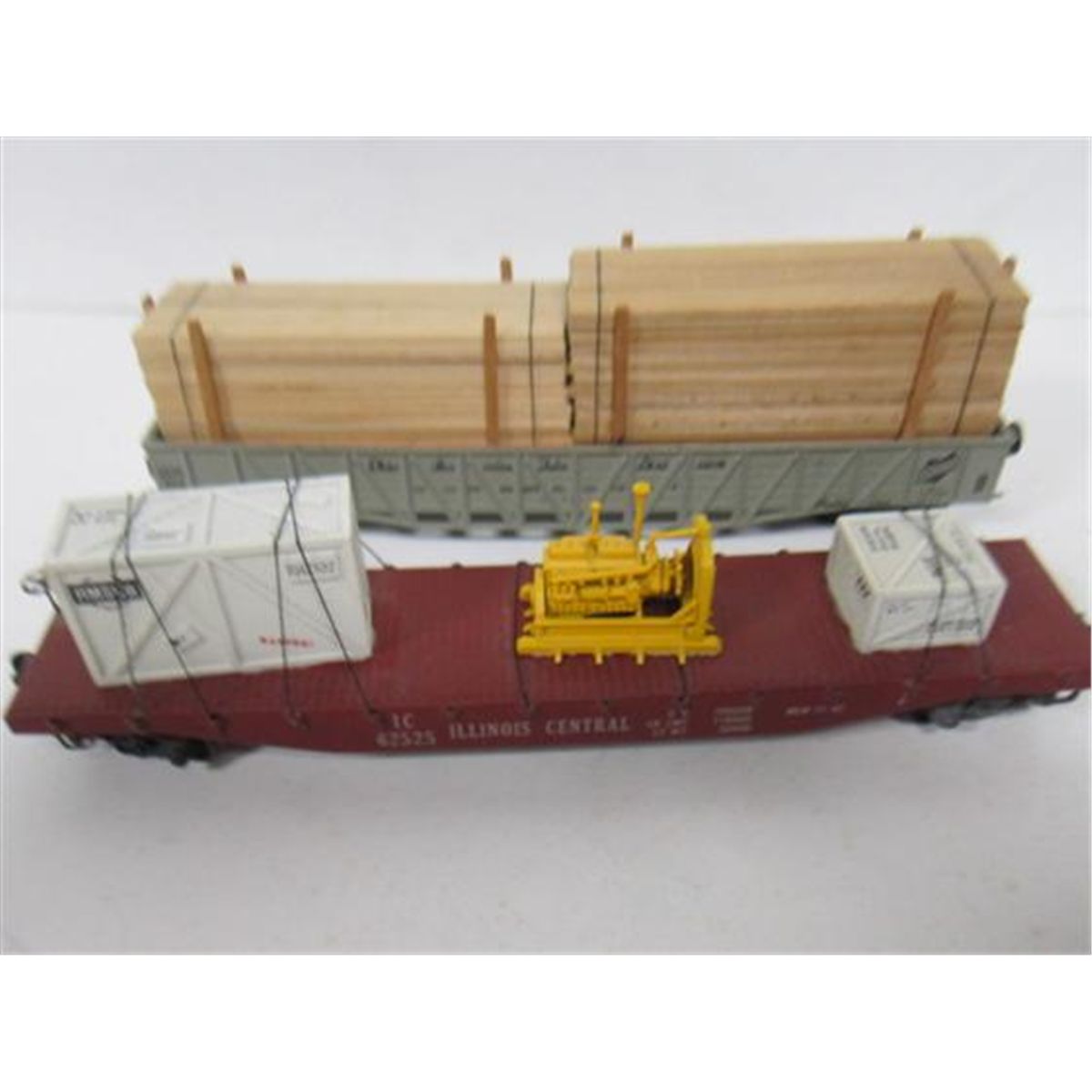 2 flat bed cars HO Scale- Illinois central 62525 with containers- Ohio Tube loaded with lumber-7"