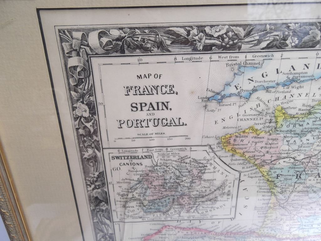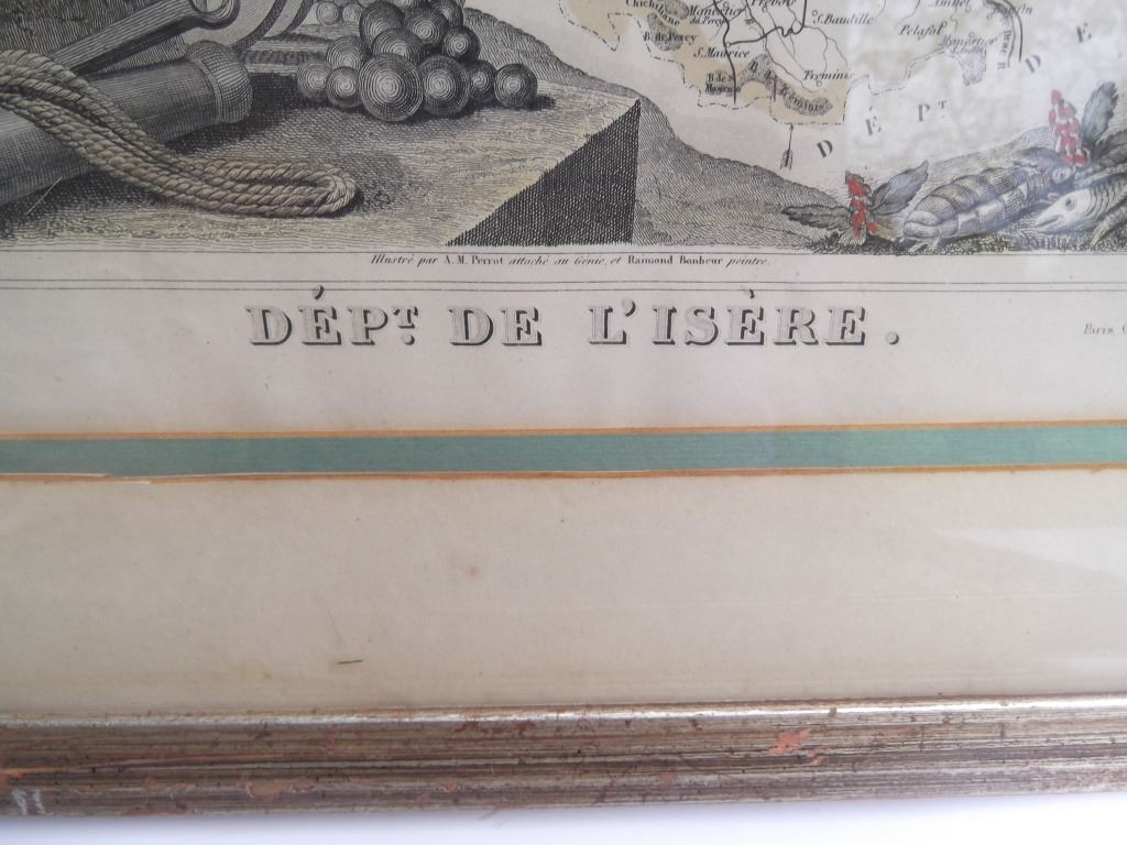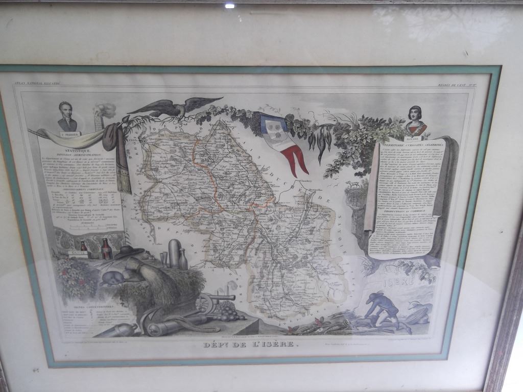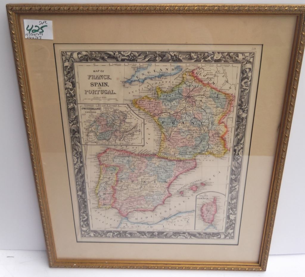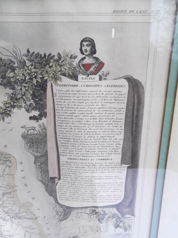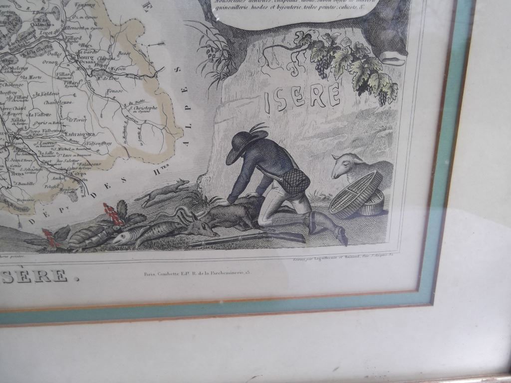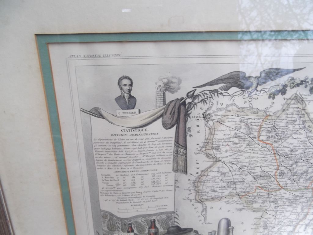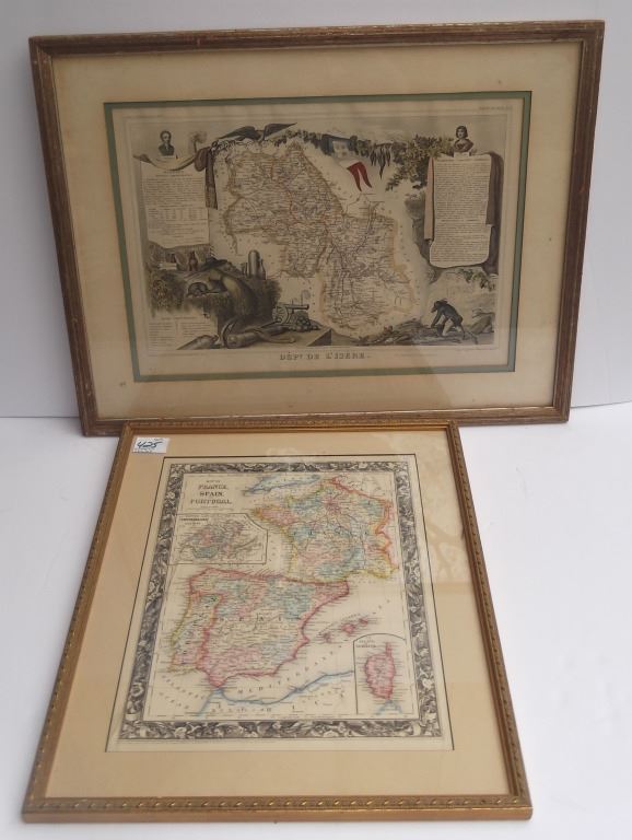 2 framed map book plates including Map of France, Spain and Portugal, c. 1860; & Dept. De L'Isere from Atlas National Illustre. Foxing; creases. Largest measures 18 inches x 23 inches.