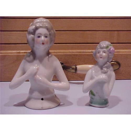 Both of these half dolls are lovely. The smaller one says Made in Japan. She has no flaws. I think inside she is marked 641--hard to read. She is about 3" tall.The larger doll that is about 4" tall is not marked so I am assuming she is German made because the Japanese always marked their dolls. She also is very nice with just a tiny paint flaw on the back of her head. It is a factory flaw and very small so it does not affect value. These are the only two half dolls from a large collection that I have left so I have combined them and made their reserve low so they can be sold quickly and as a bargain. If not in an auction make me an offer.