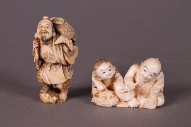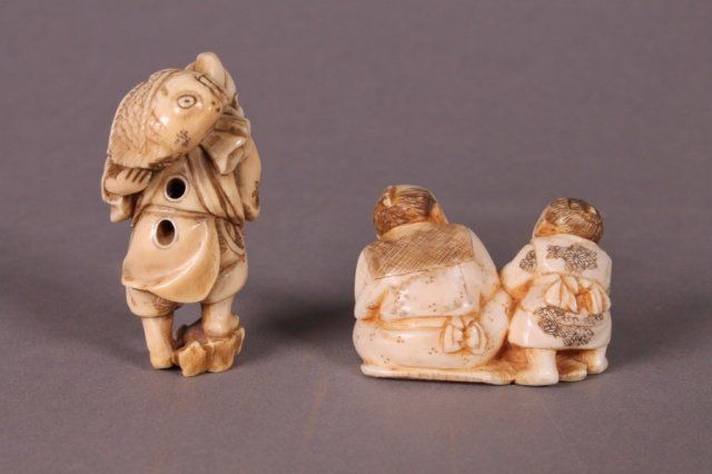 2 ivory netsukes: man carrying fish, 2 men.