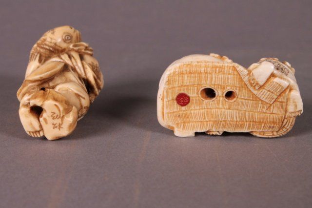 A group of two carved ivory netsukes. 1st half 20th century. ++ Two figures holding pipe and basket. 1"h x 1 3/4"w. ++ Man carrying a fish on his back. 2"h x 1"w.