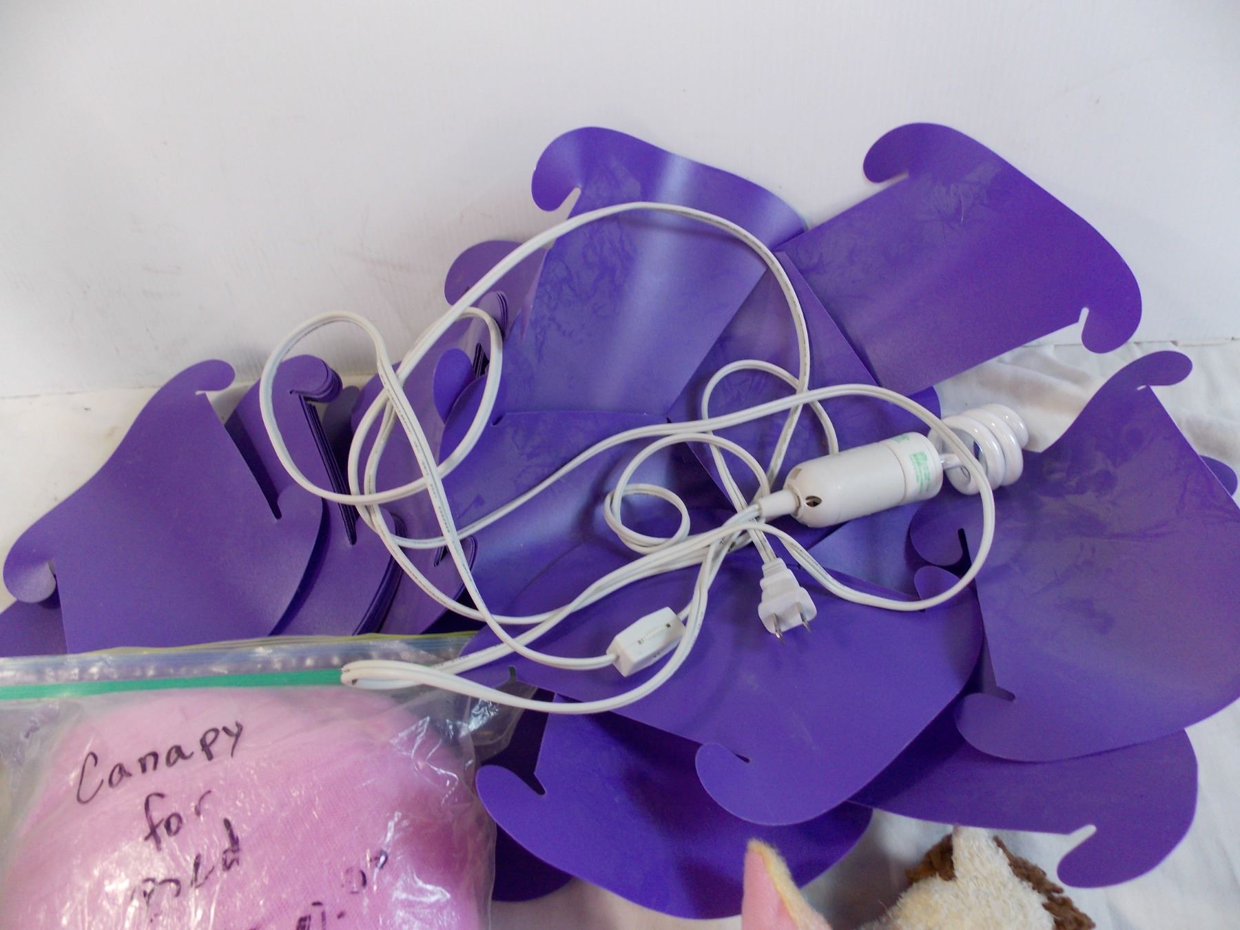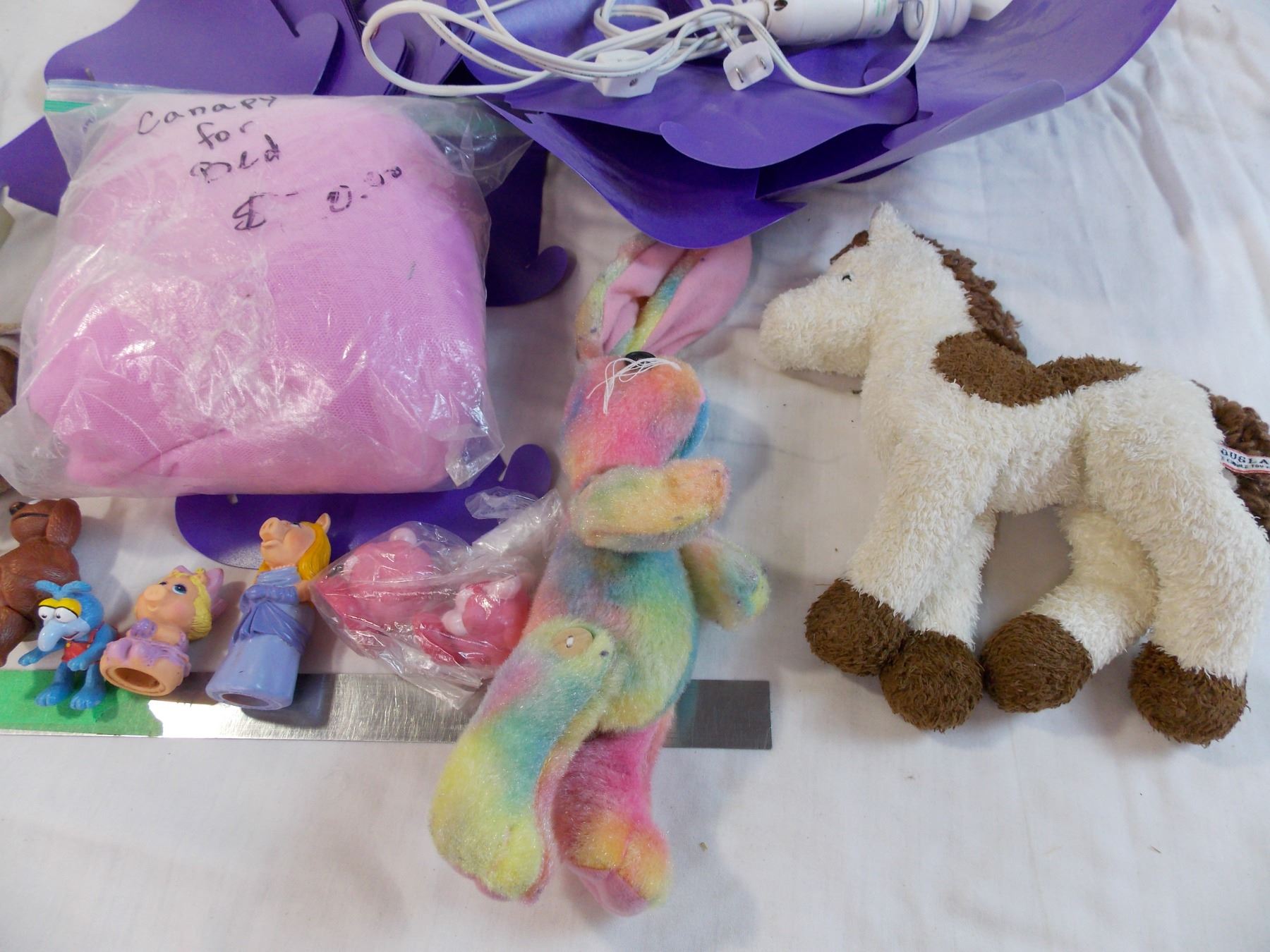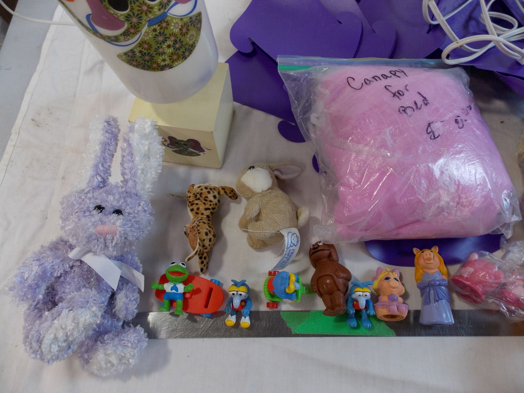 2 lamps, muppets toys, stuffed rabbit with buttons, bed canopy
