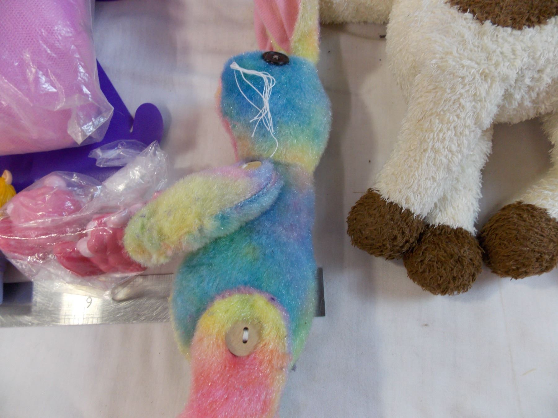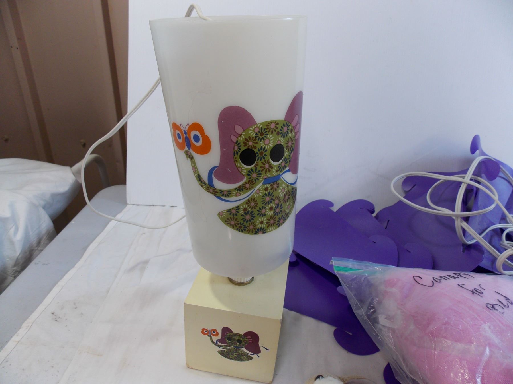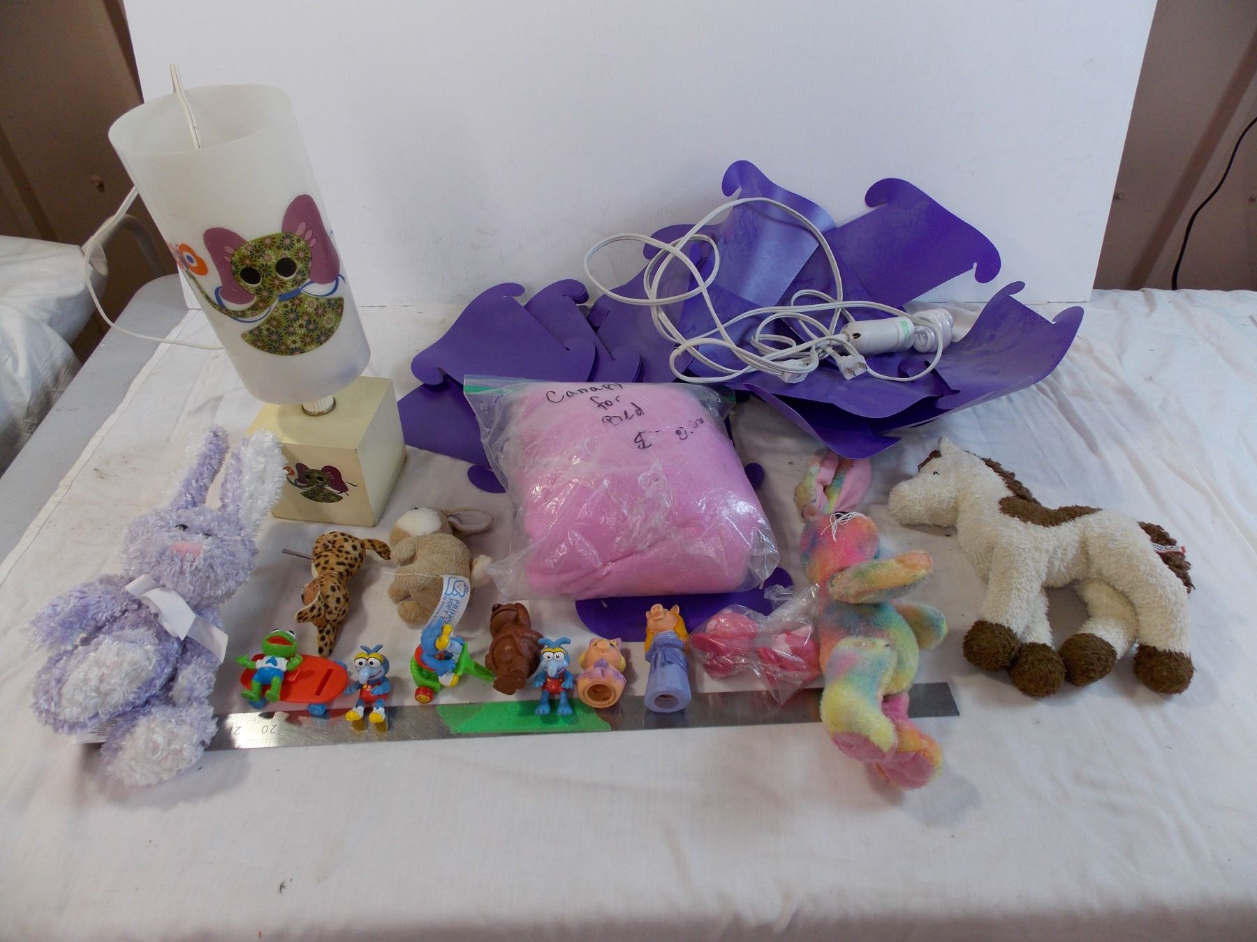 2 lamps, muppets toys, stuffed rabbit with buttons, bed canopy