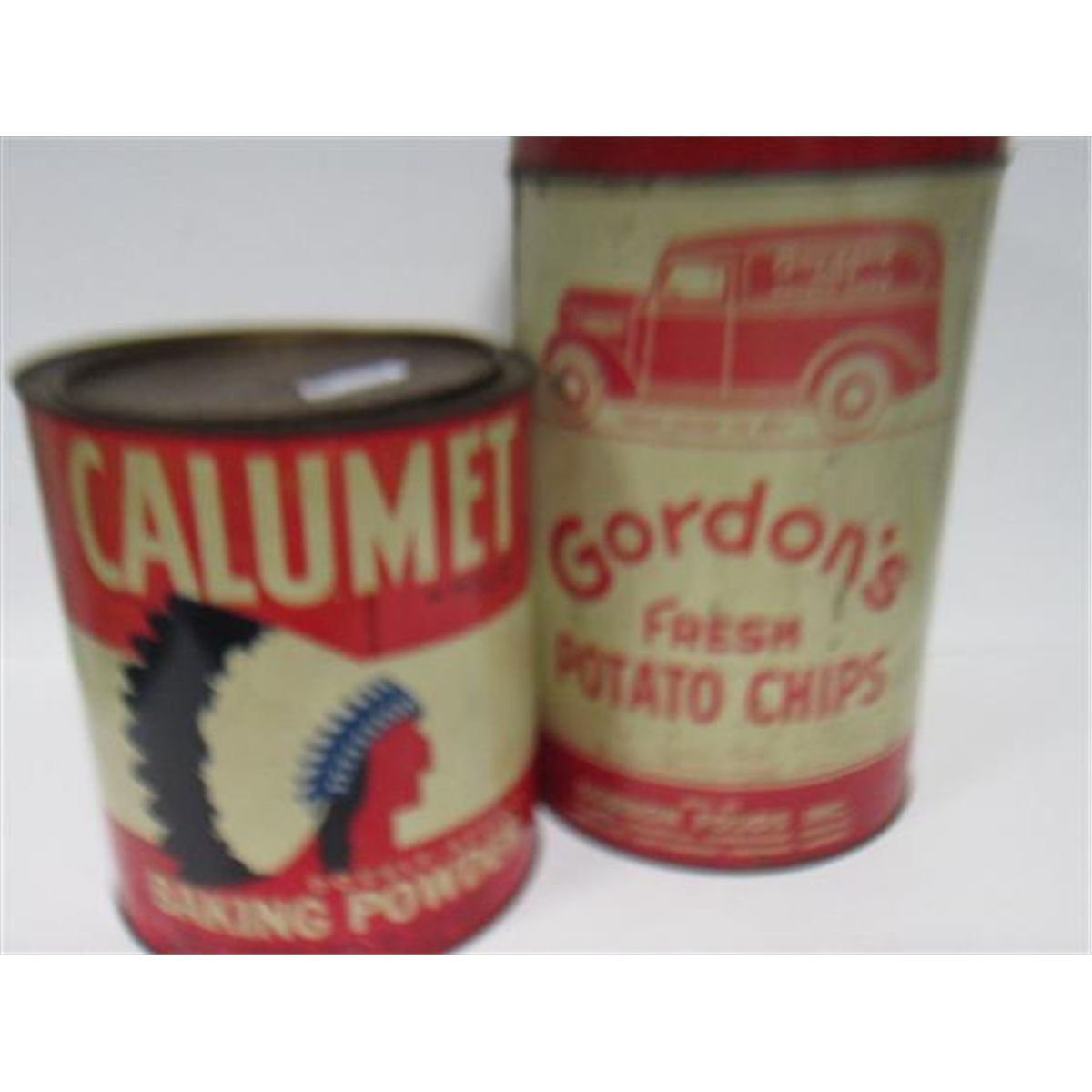 2 large tin containers-Calumet Baking powder and Gordon Fresh Potato chips-8 1/4 and 11 1/2-Red and blue colors round-