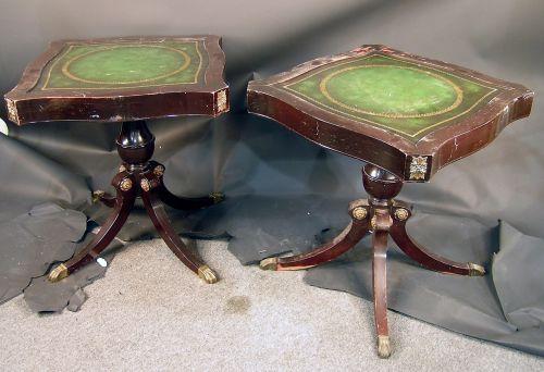 2 matching, leather top lamp tables has brass caps on legs nice tables