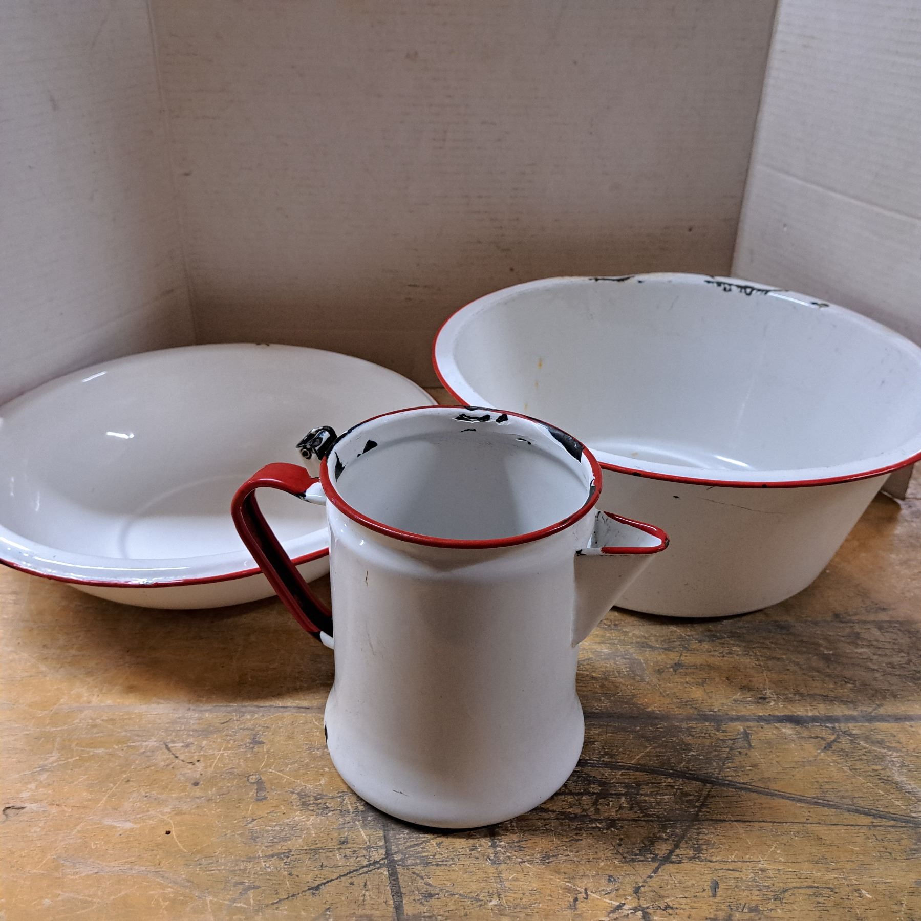 2 metal bowls and pitcher