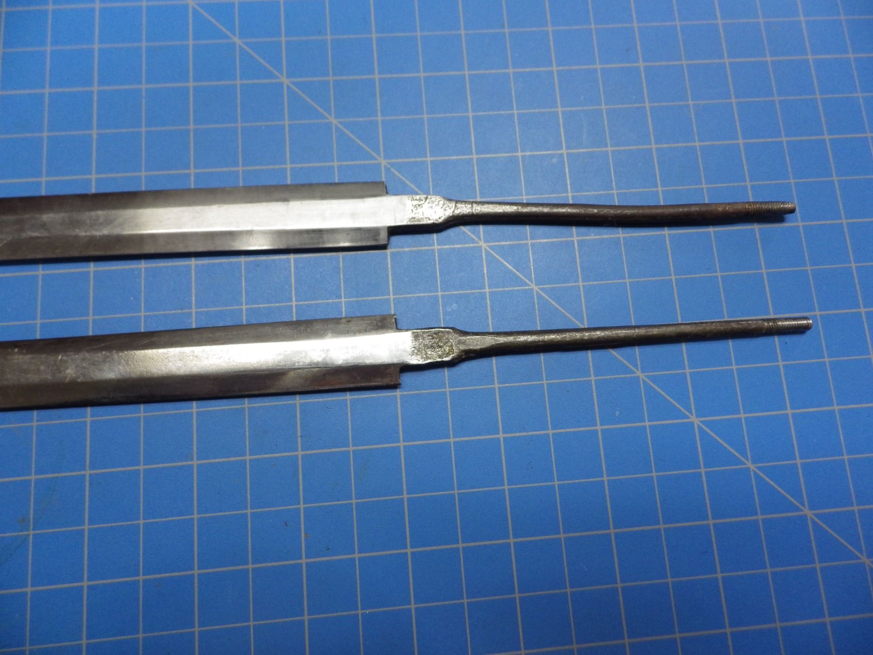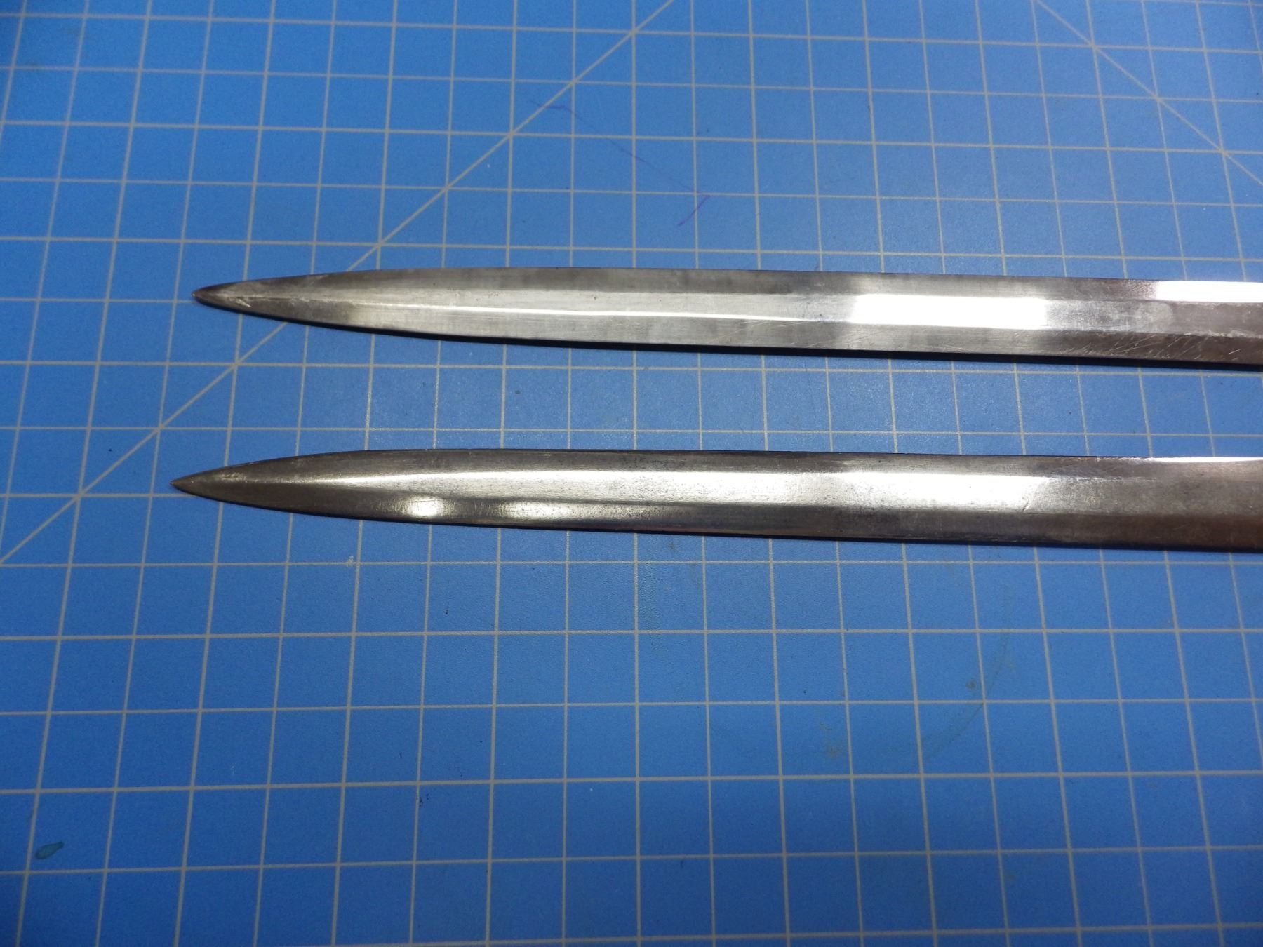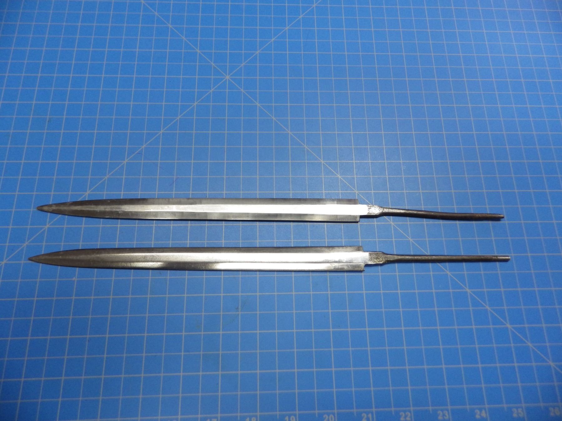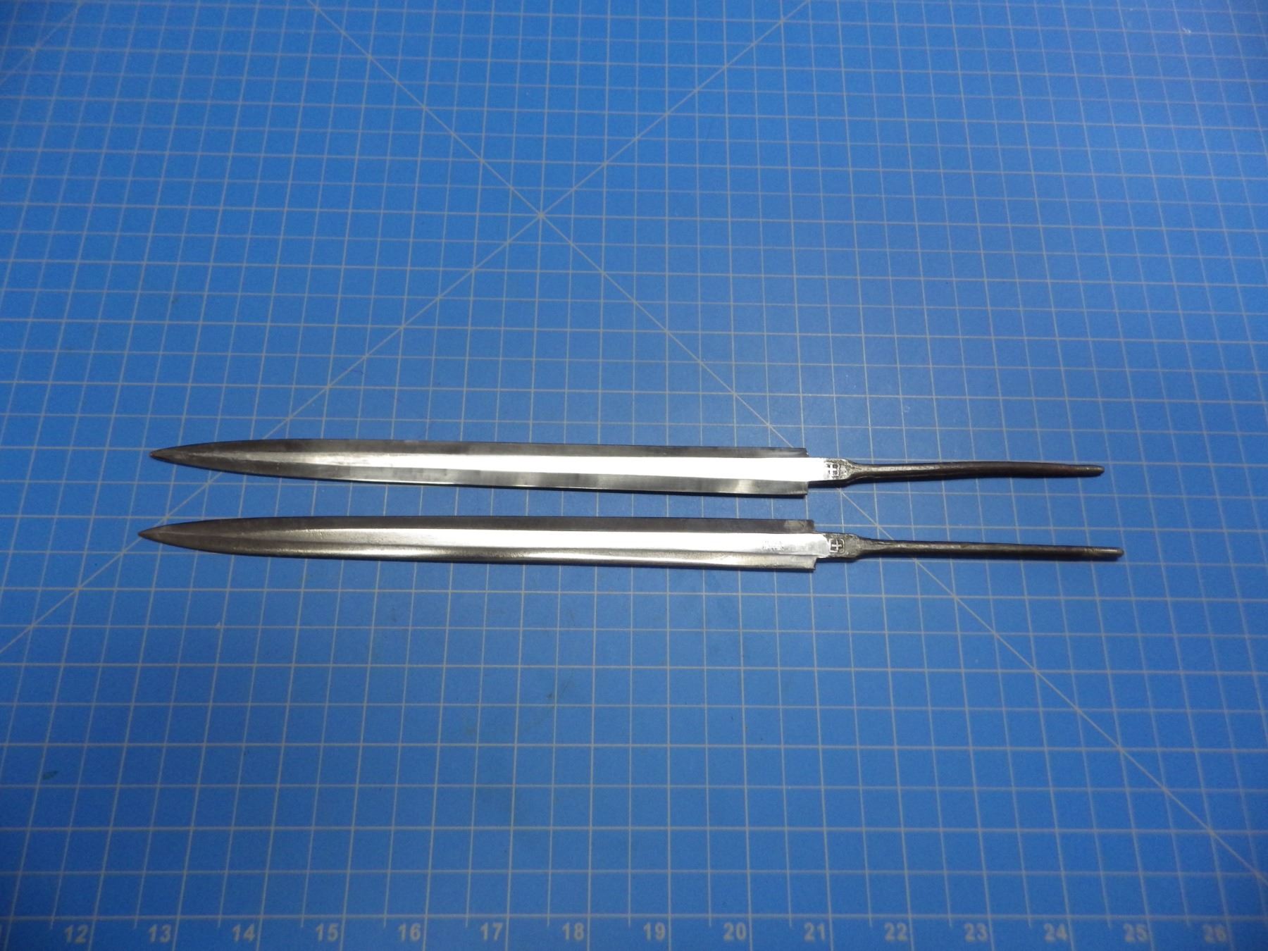 2 military double edged dagger blades, both stamped with a cross, one marked WMW Waffen, 240mm long blades.