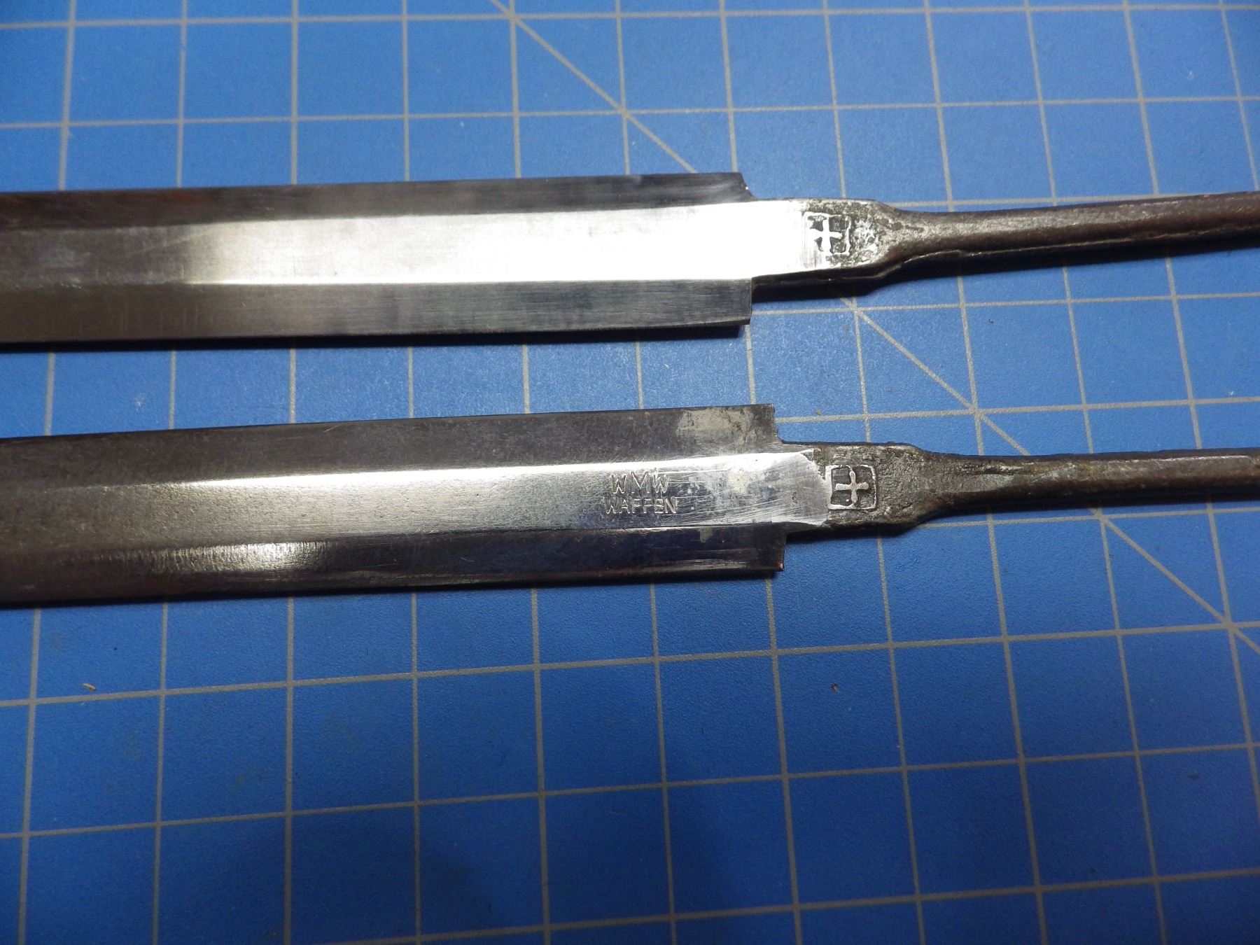 2 military double edged dagger blades, both stamped with a cross, one marked WMW Waffen, 240mm long