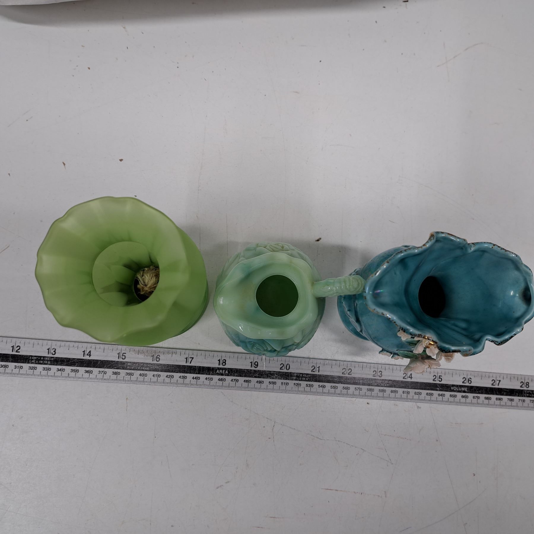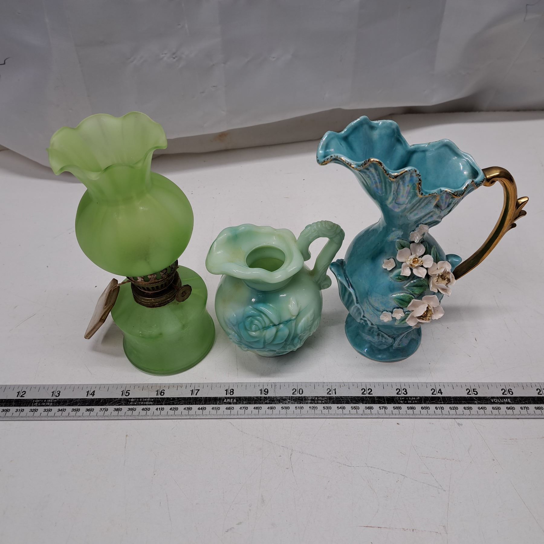 2 mini pitchers and vase with a wick