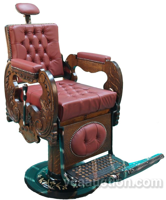 2 of 2 Matching Berninghaus Barber Chairs Very Heavily Carved and Professionally Restored with Genuine Oxblood Leather and Copper Flash Plating. Berninghaus made the very finest chairs during their short lifespan..