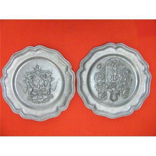the pair of victorian spanish and detailed plates are made of pewter in Spain. they are manufactured and numbered in spain. one has a sticker with the name of manufacturer.they are original with excellent workmanship. very decorative and measures 9 inches with ruffle edges and two different subjects! " they both have different crests in the middle! fine decor for a fine home!