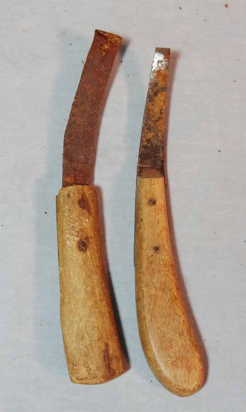 2 older hoof knives, one w/bone handle, one maker marked; 2 hand forged blacksmith tong; 2 Diamond h