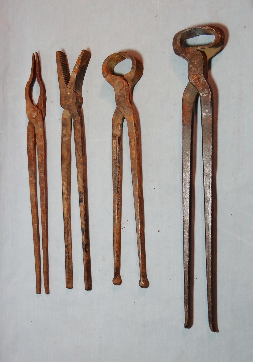 2 older hoof knives, one w/bone handle, one maker marked; 2 hand forged blacksmith tong; 2 Diamond hoof nippers