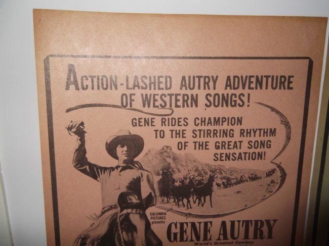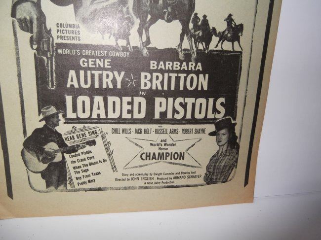 2 original Gene Autry day bills including "Mule Train" & "Loaded Pistol" Foxing. 9 inches x 13 inches.