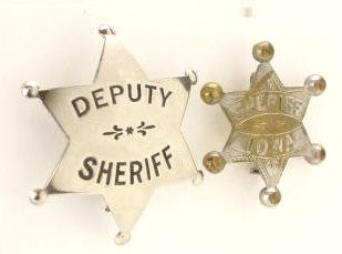 2 original badges includes 6 point Sheriff Iowa showing heavy wear and Deputy Sheriff badge.