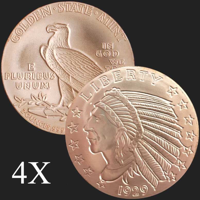 4 units of 2 oz Incuse Indian .999 Fine Copper Bullion Round
