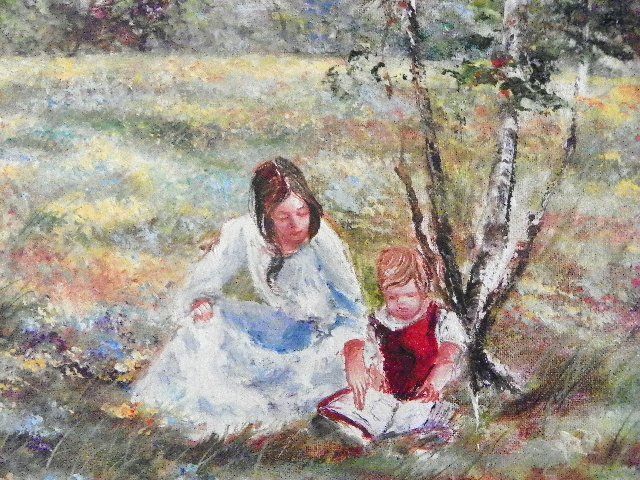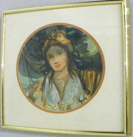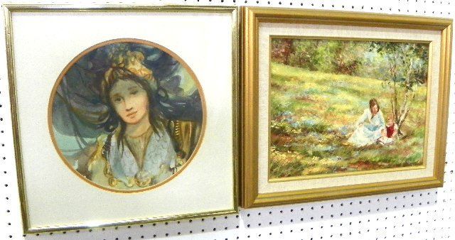 1- Watercolor, "Portrait of a Woman", signed Marizzano, approx. 17" x 17" framed. 1- Oil painting on canvas, "Mother & Child in Landscape", signed, approx. 16" x 20" framed. Please read our terms of sale.