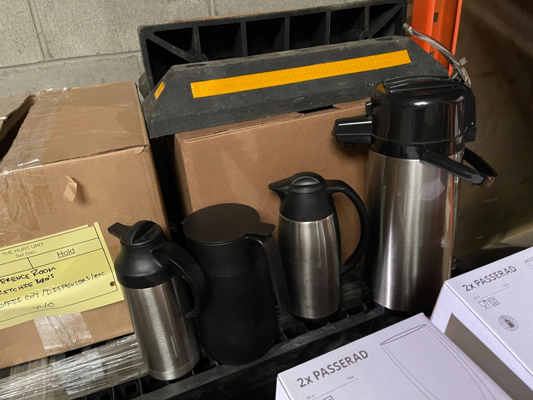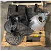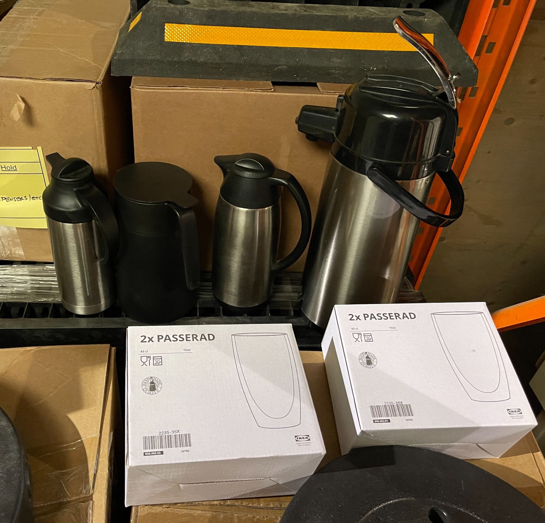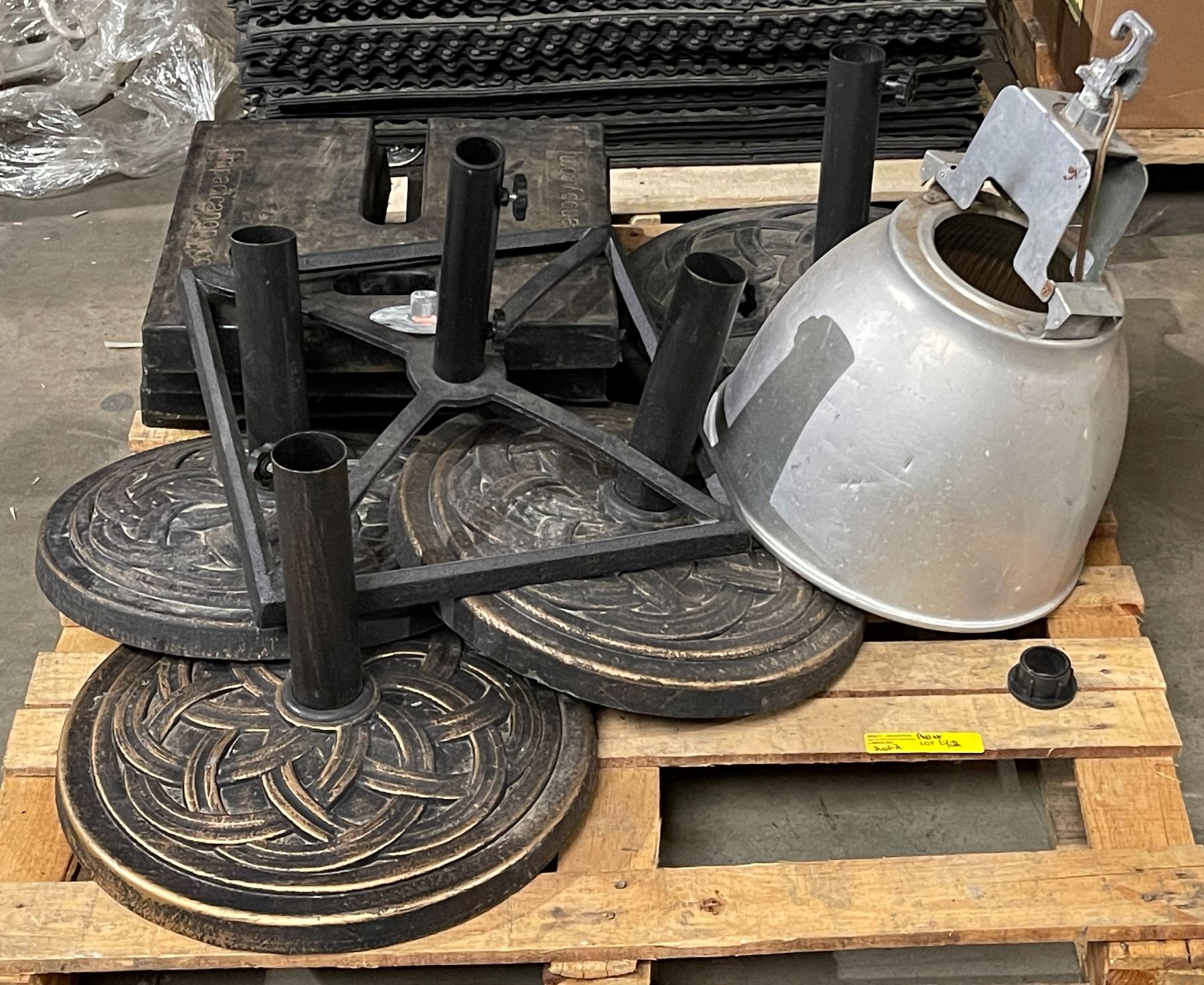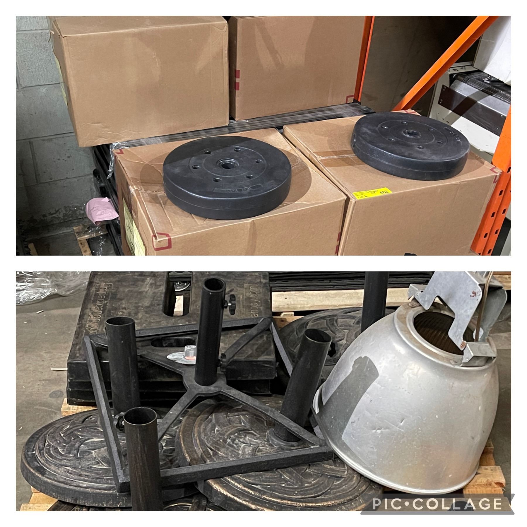 2 pallets full of assorted misc items - includes weights / Passerad glass cups / coffee cups / coffee dispensers / metal umbrella bases / aluminum shade hanging light etc