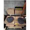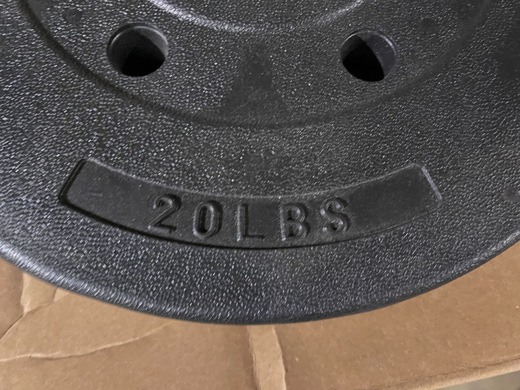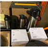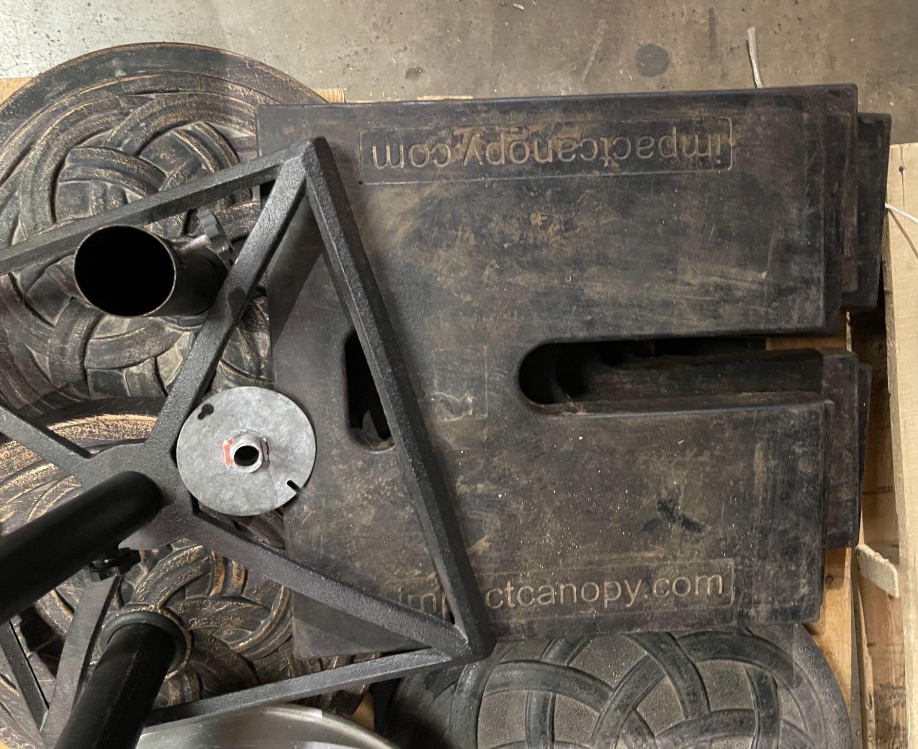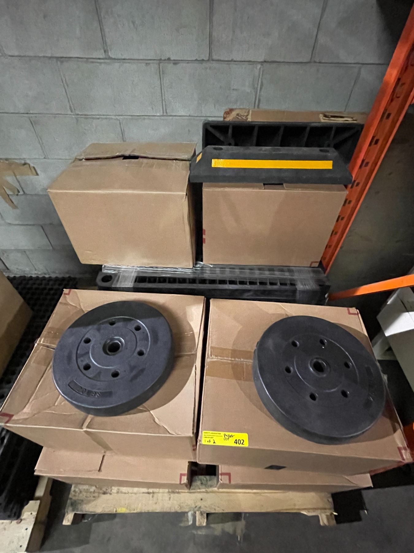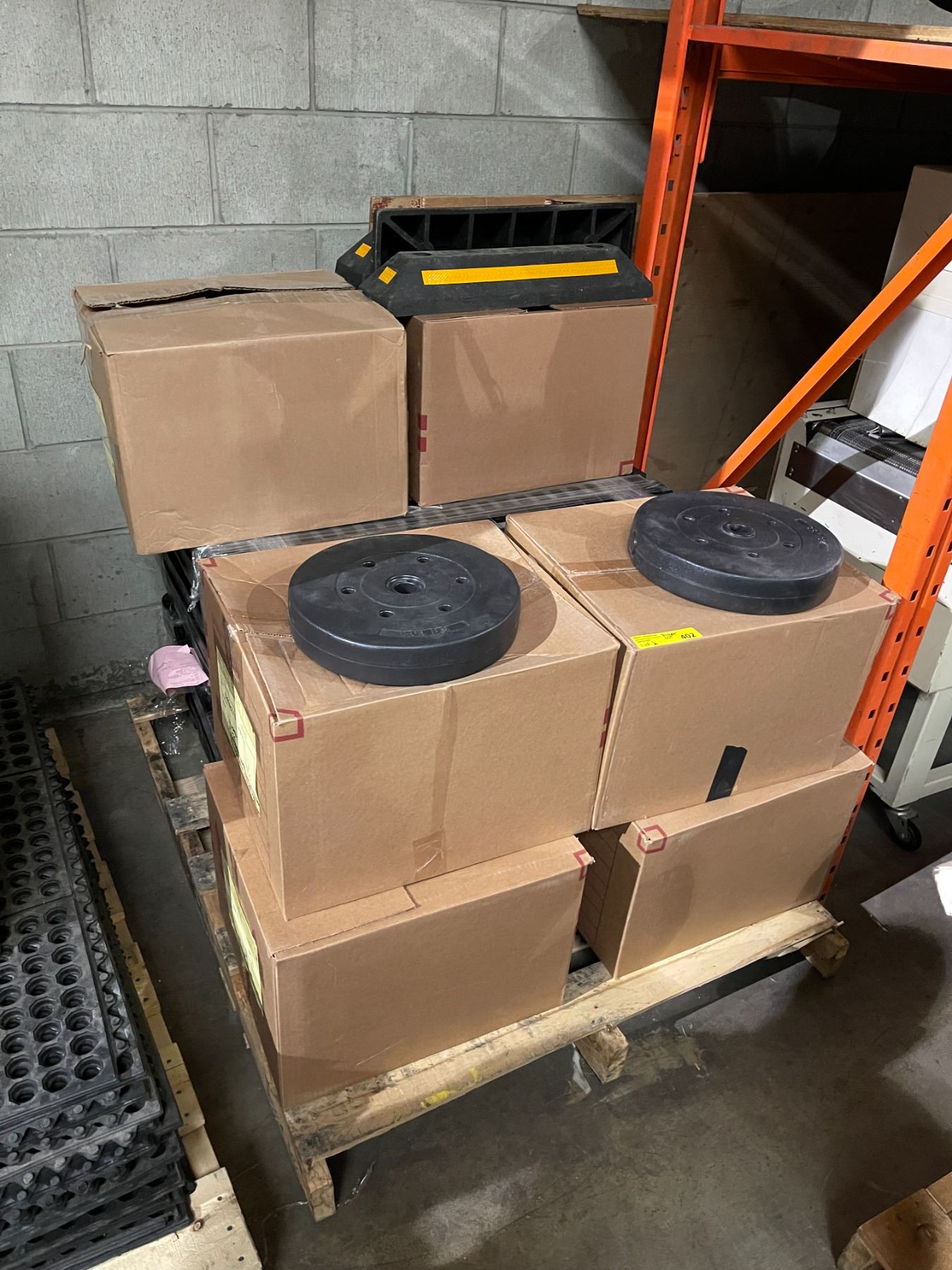 2 pallets full of assorted misc items - includes weights / Passerad glass cups / coffee cups / coffee dispensers / metal umbrella bases / aluminum shade hanging light etc