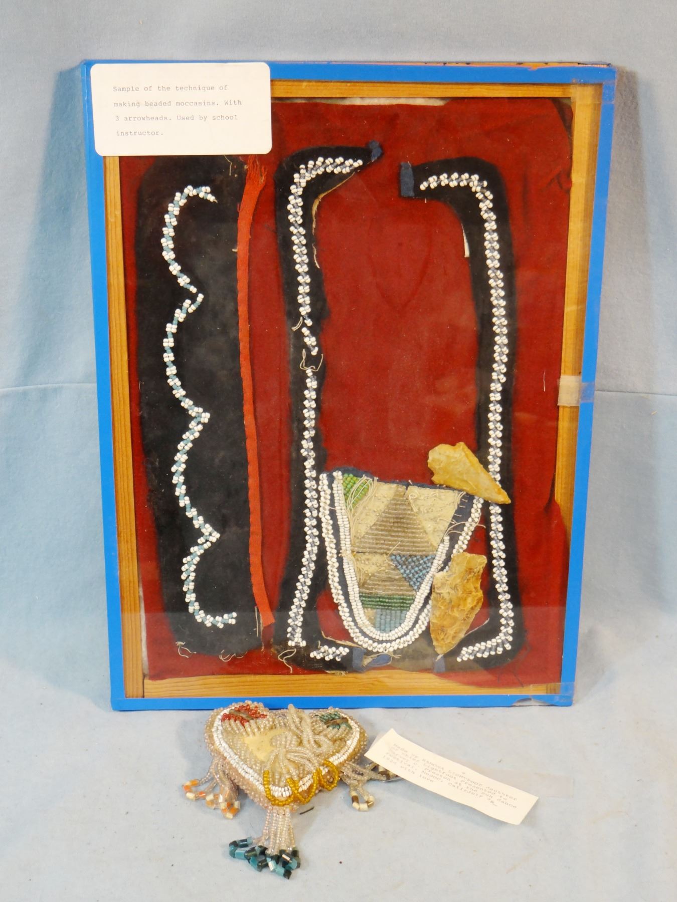 2 pcs: Vintage bead making technique samples with 3 arrowheads and beads in a case and a beaded stuffed heart