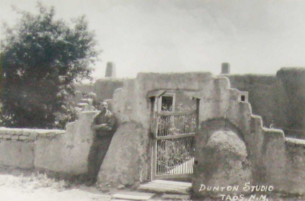 William Herbert “Buck” Dunton (1878-1936) at his studio in Taos, NM, vintage photograph, 6” x 8”; and Joseph Henry Sharp sketching near his summer studio in Taos, NM, vintage photograph, no date. 6-1/4” x 8”.