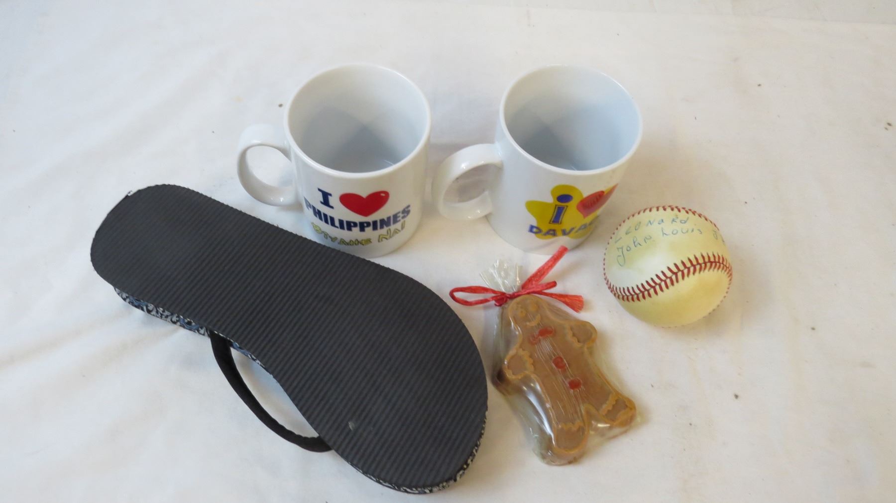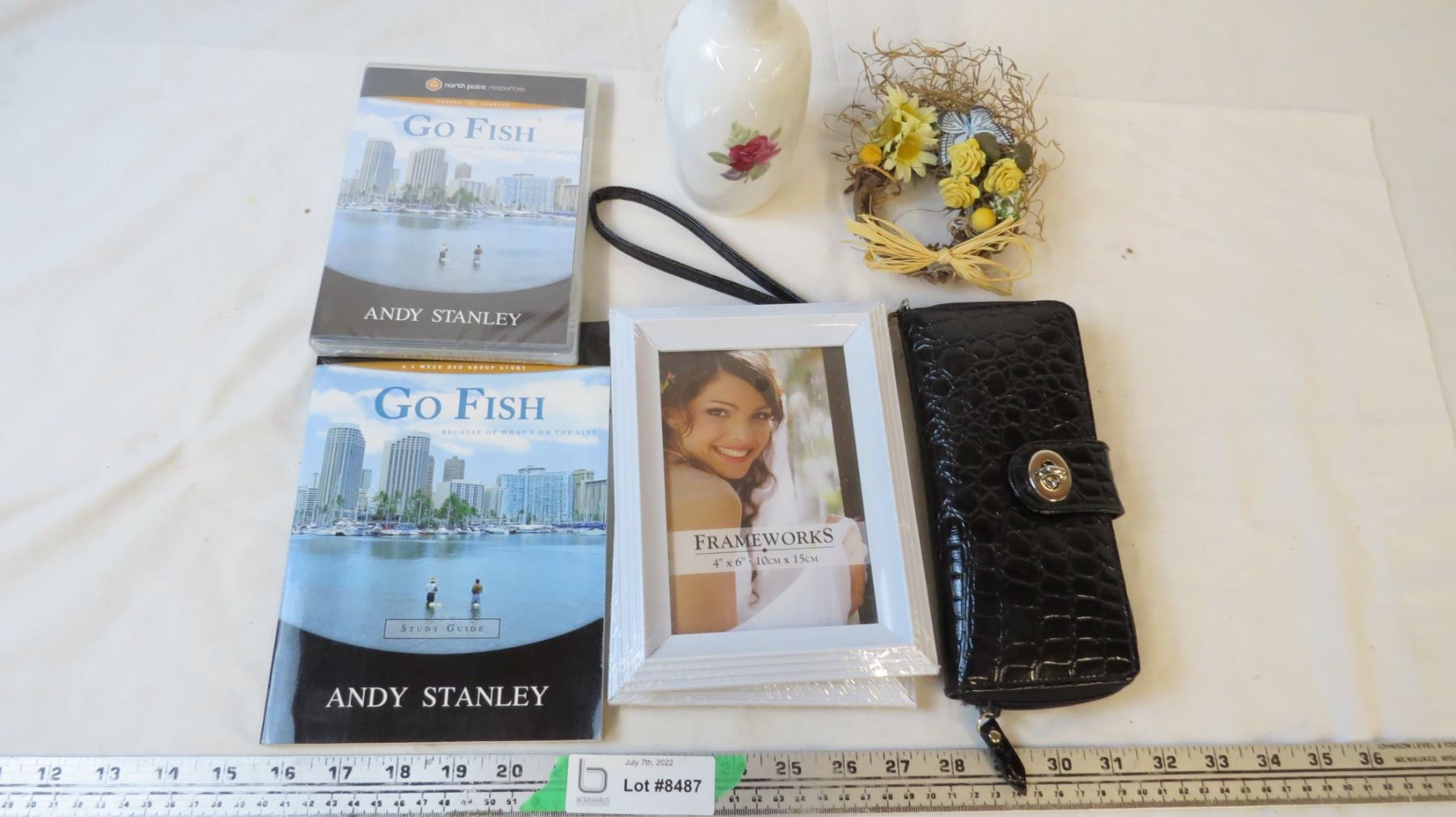 (2) picture frames, wallet, sandals,cups,vase