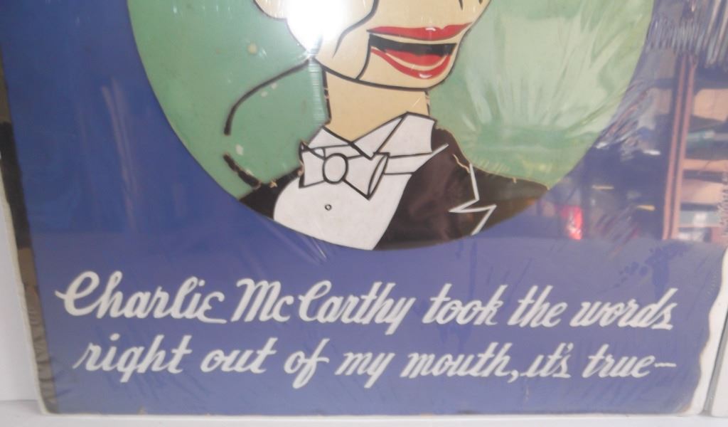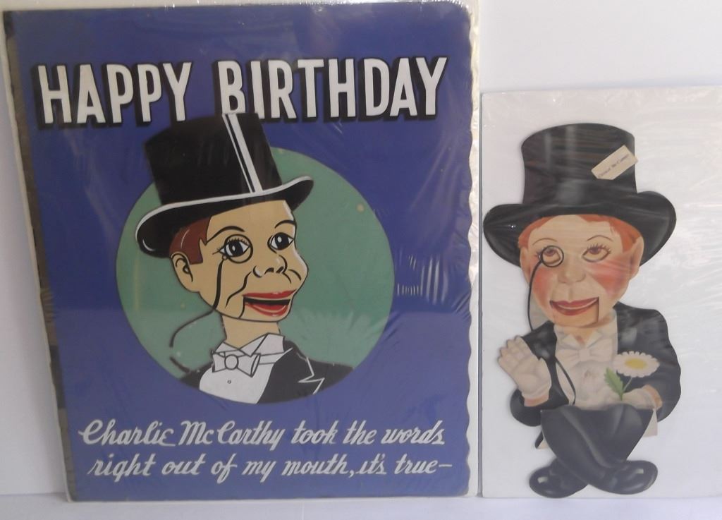 2 piece Charlie McCarthy lot including c. 1938 die cut; & large Happy Birthday card. Used condition. Largest measures 19 inches x 23 inches.