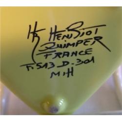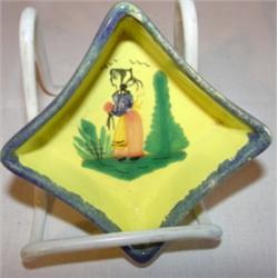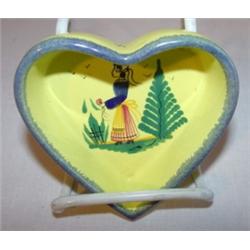 2 piece lot of Quimper consisting of heart form ring dish and square ring dish. Heart form dish is 3 1/4" wide and square dish is 2 1/4" with minor flaking on outer edge. Heart form dish is marked on bottom HB. Henriot-Quimper-France-F.S13 D.301 and artist MH initials. Square dish is marked on bottom Quimper France and F.513-D.201 and artist LJ initials.