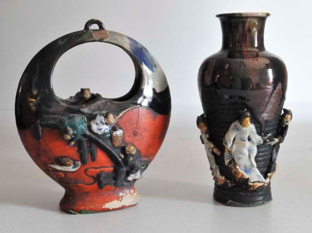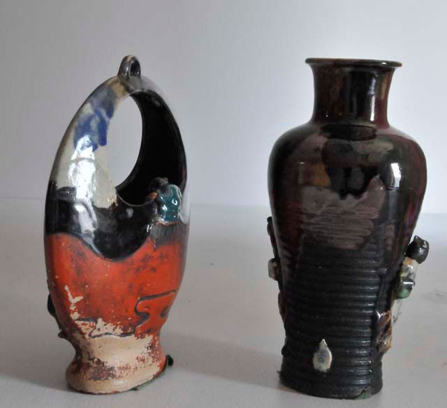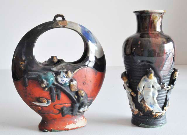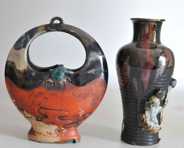 Including: 1- Pillow shaped hanging planter depicting "3 Men on a Bridge"& "Woman Climbing" on opposite side, approx. 8.5" H. 1- "3 Woman" in relief, with Ban-ni Family mark, approx. 8.75" H. Please read our terms of sale.