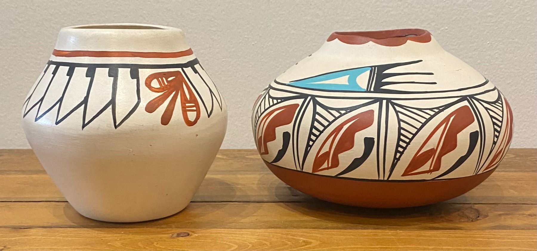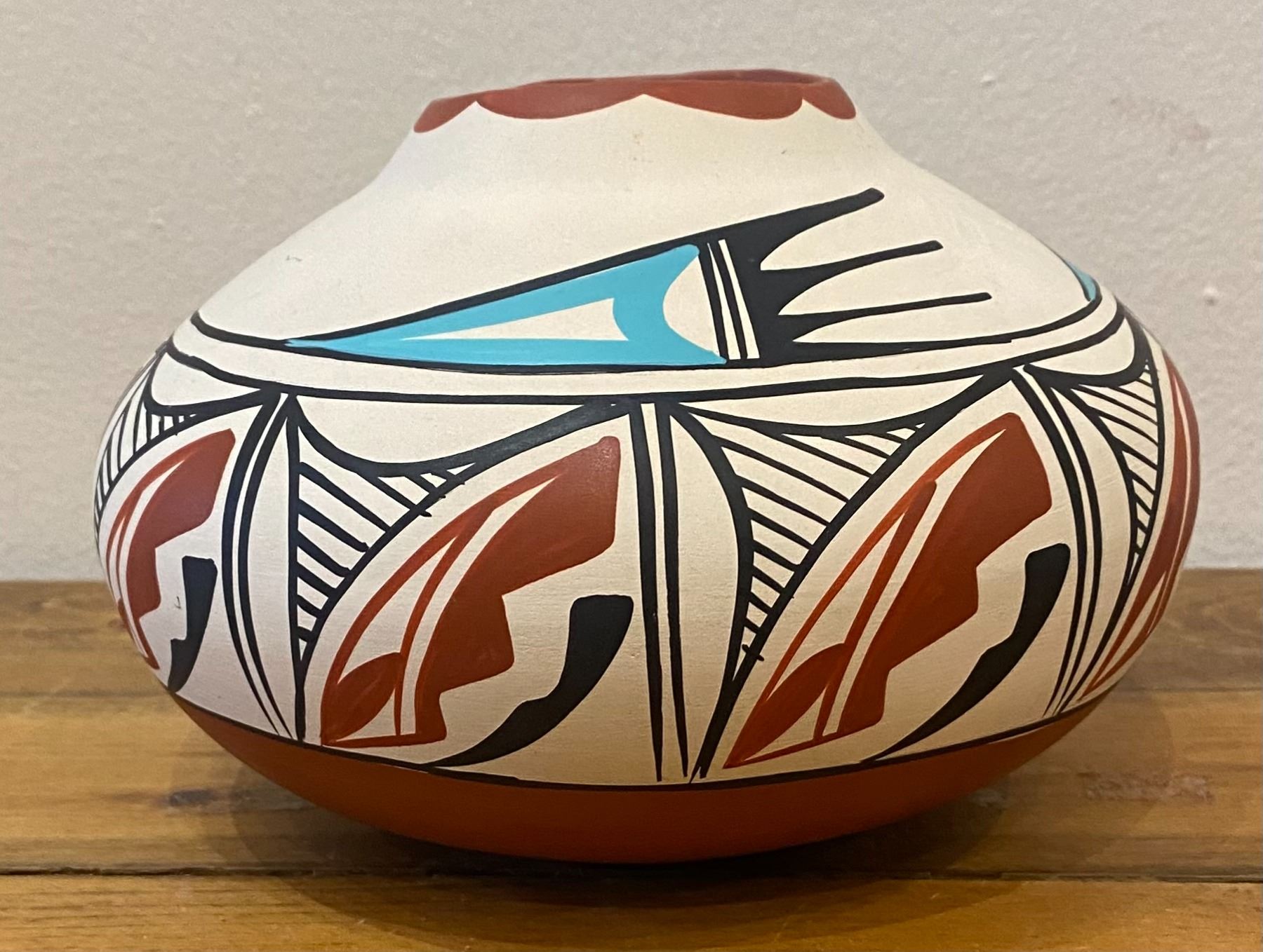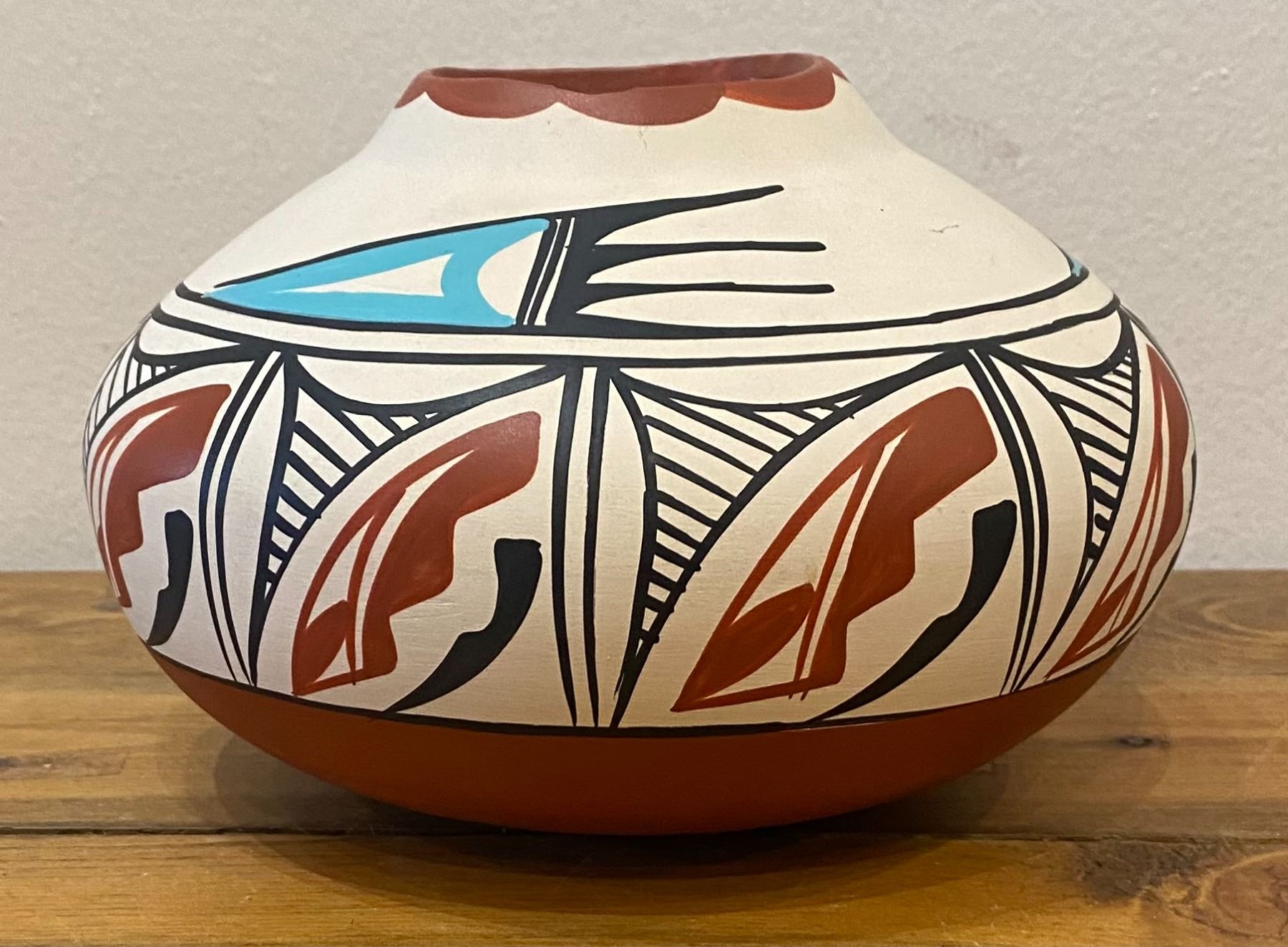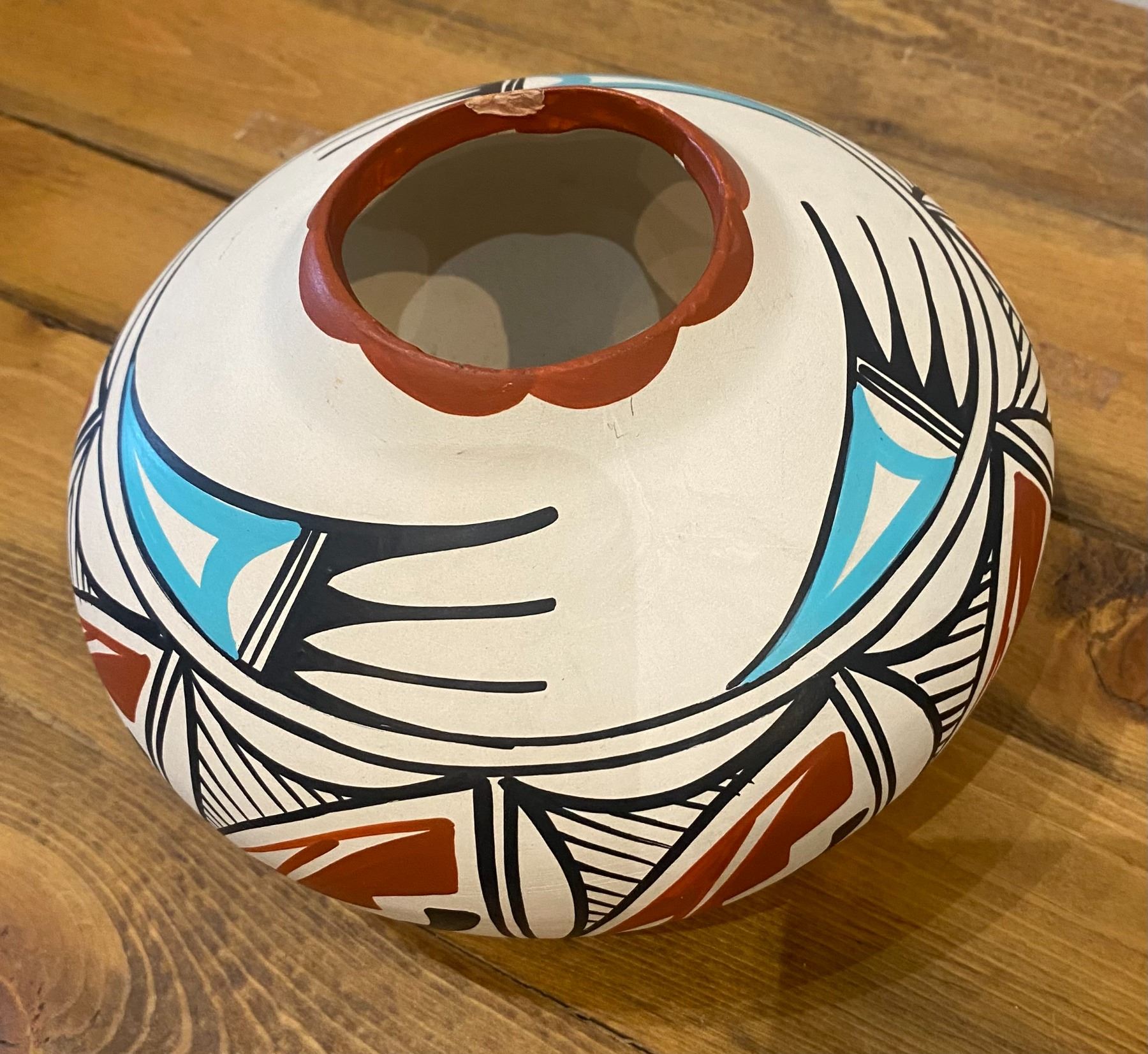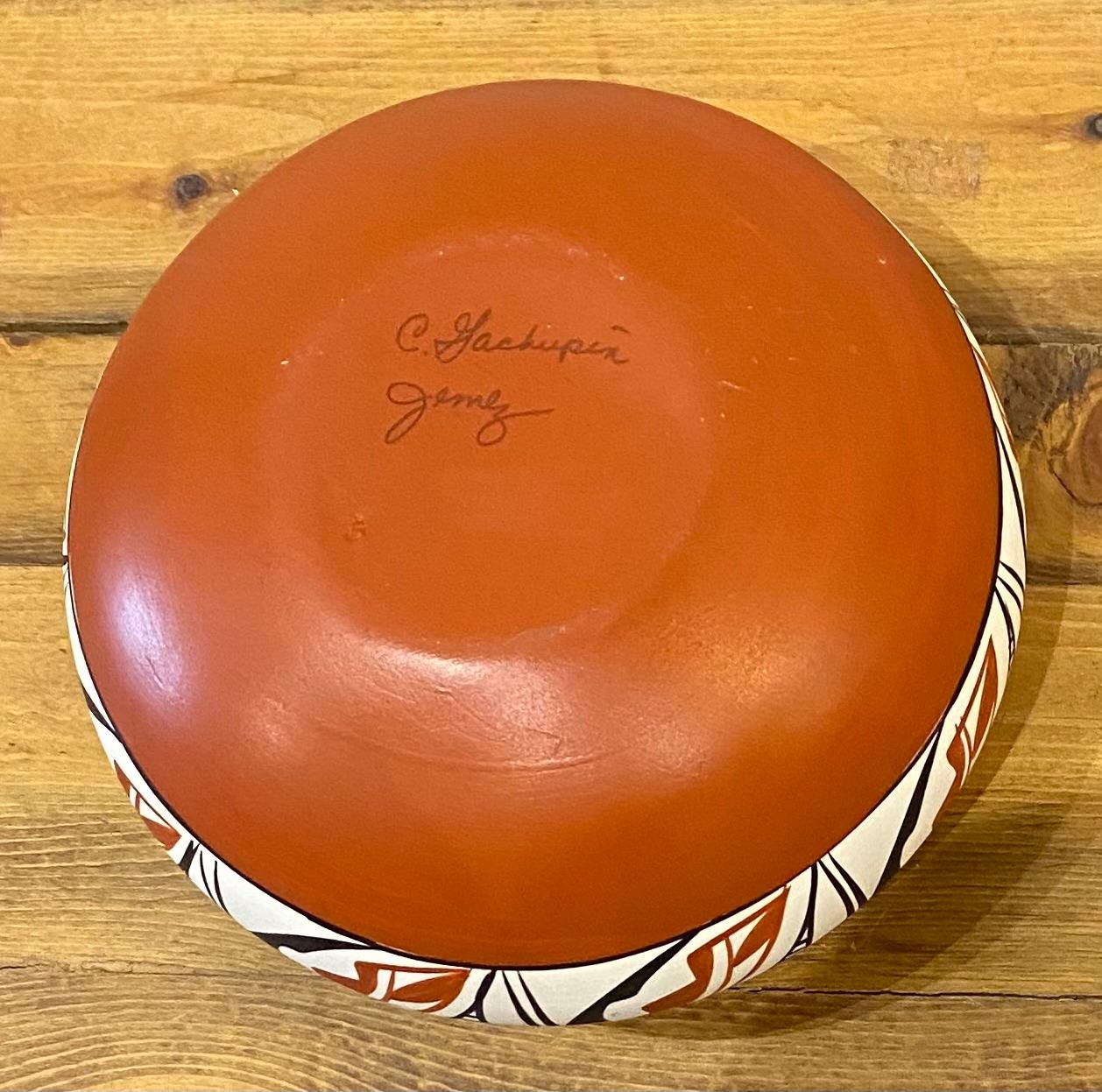 A Larger Jemez Bowl signed C Gachupin. Large 4.75-inches tall by 6.5-inches wide. Unfortunately, this piece has a small inside rim chip. See Pictures
