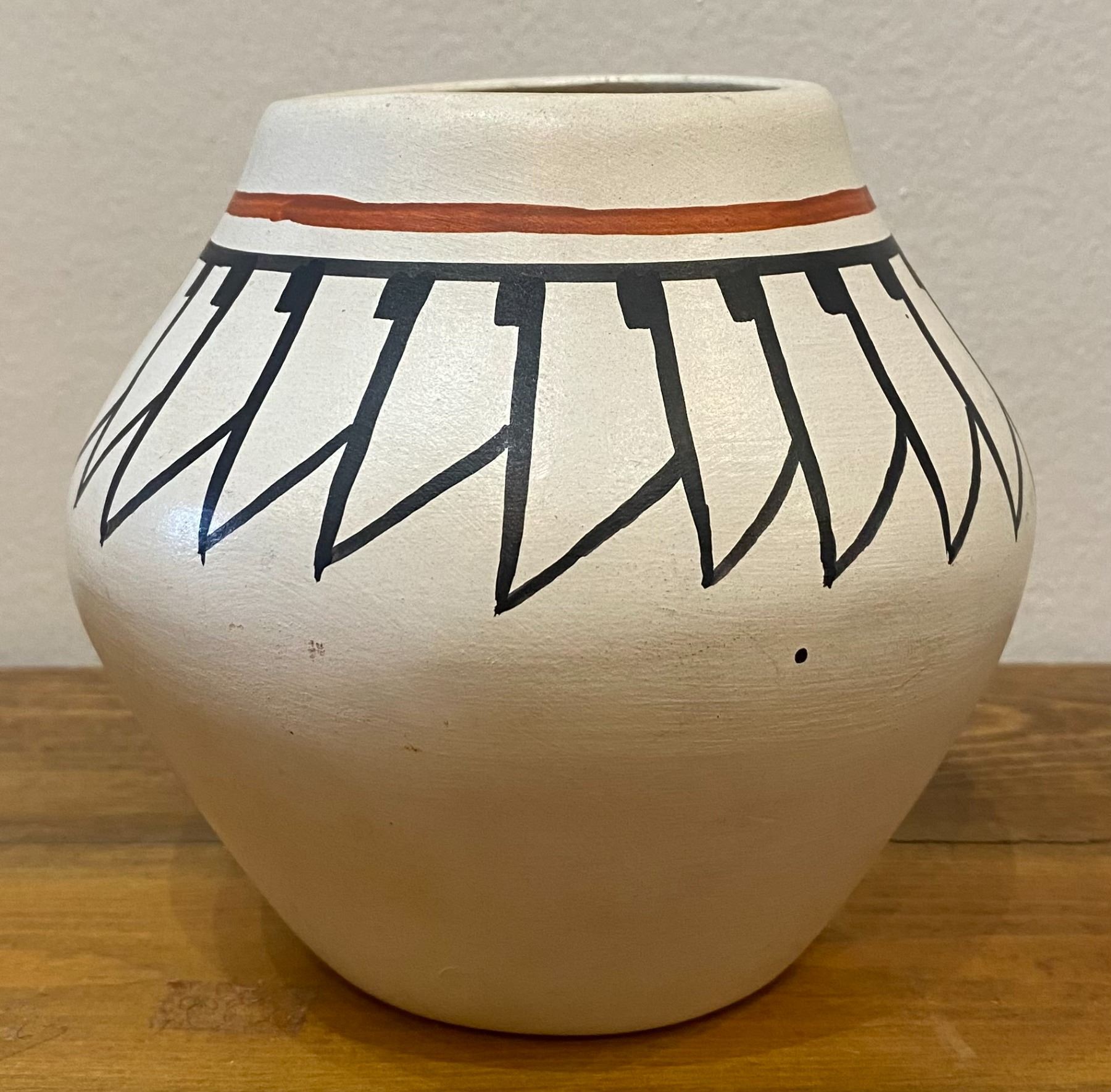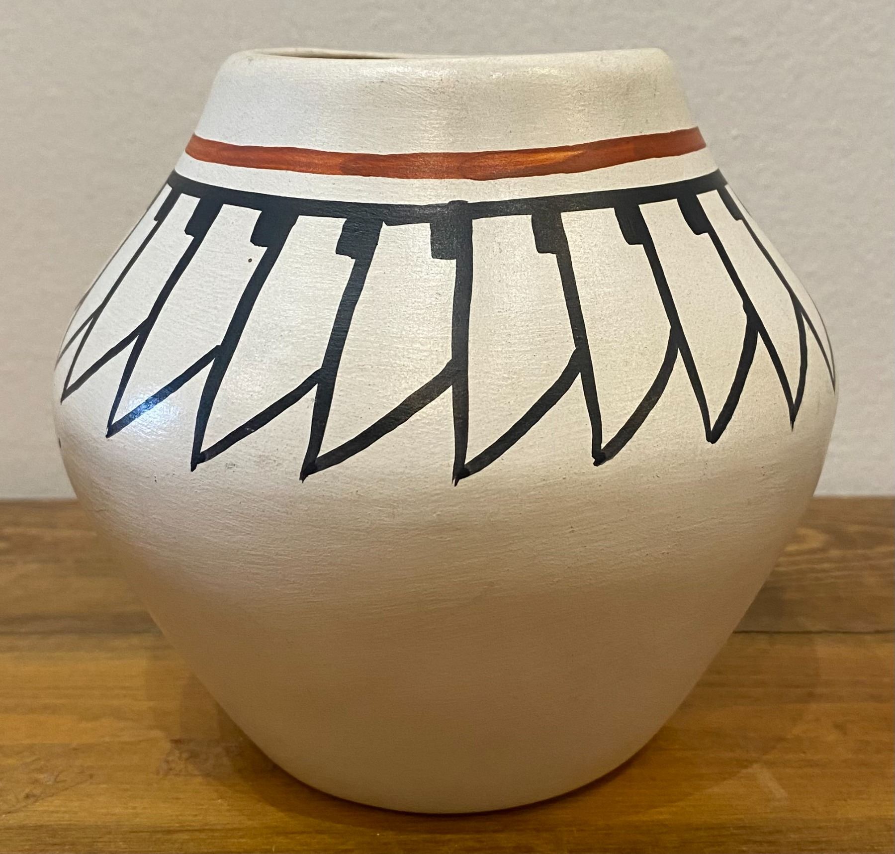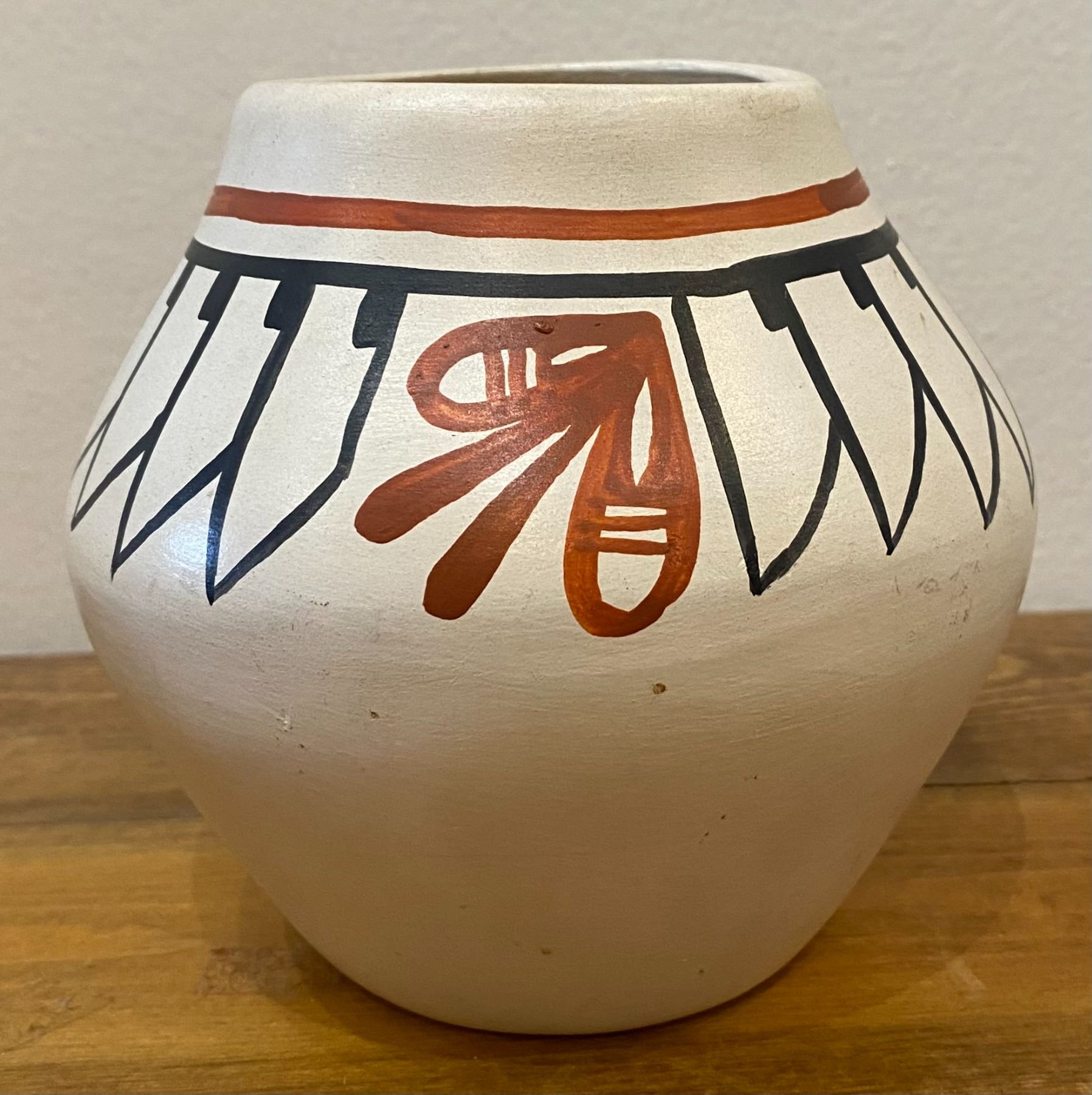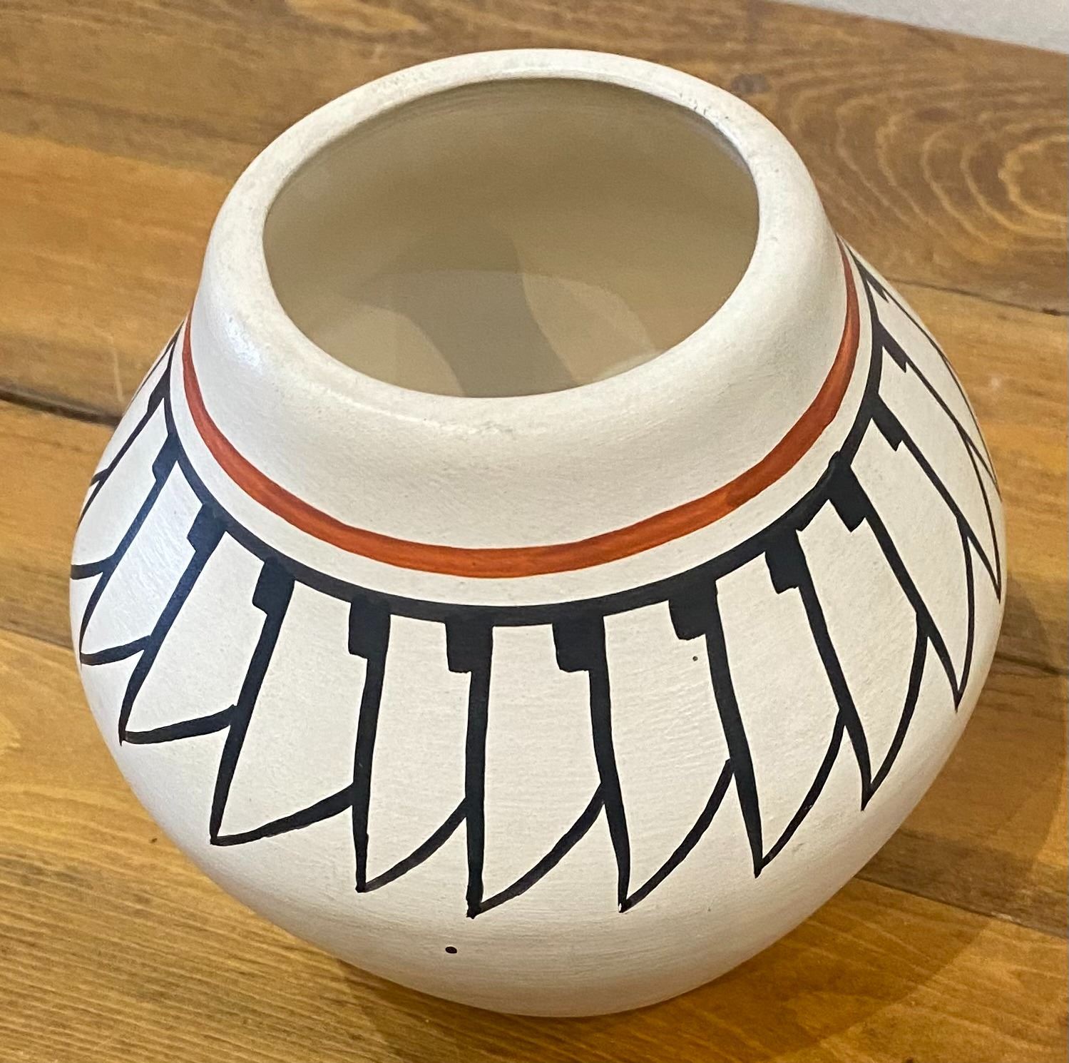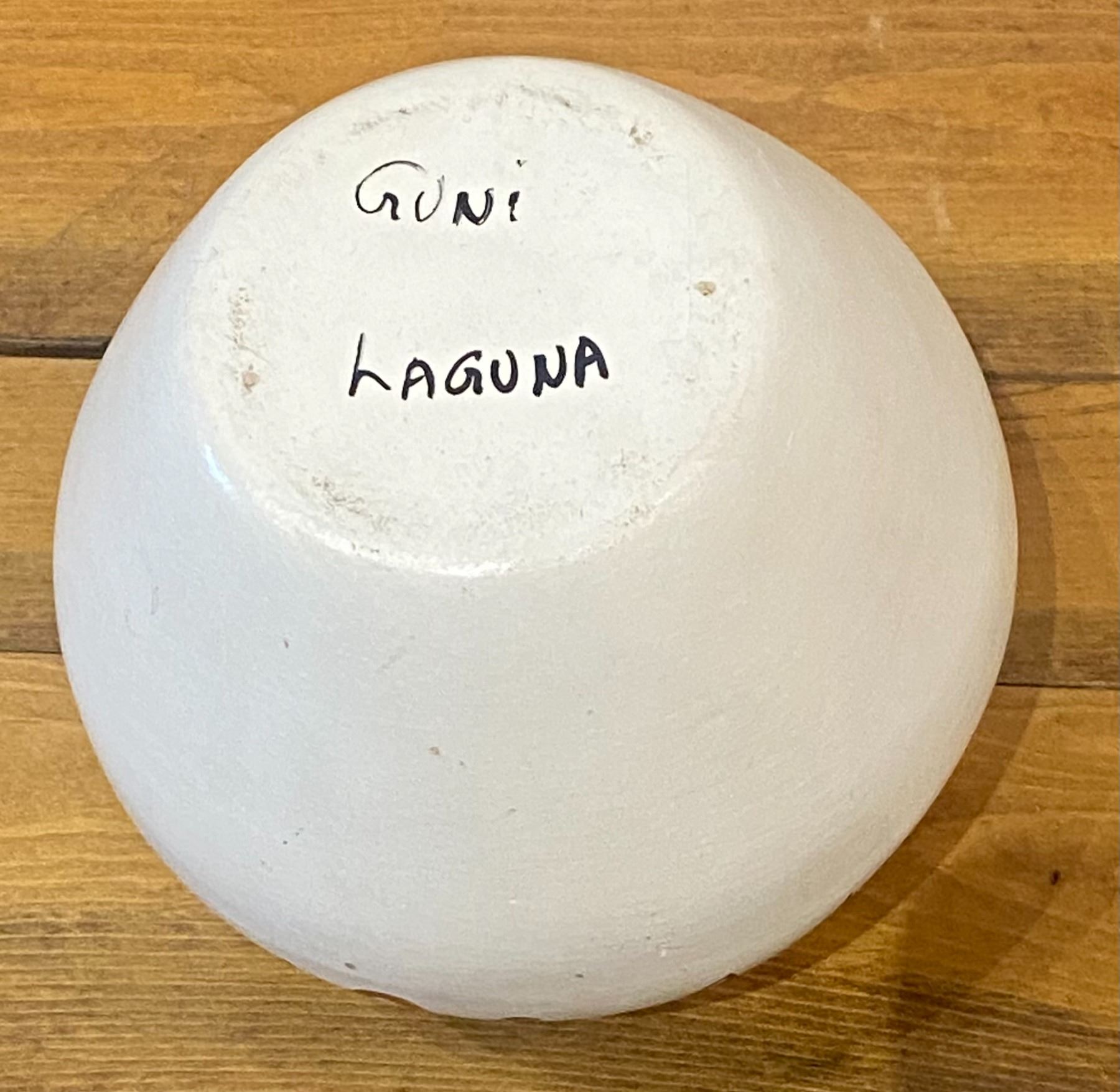 Laguna Jar with Feather Design signed Guni. Measures 4.75-inches tall with the widest portion being 5-inches.