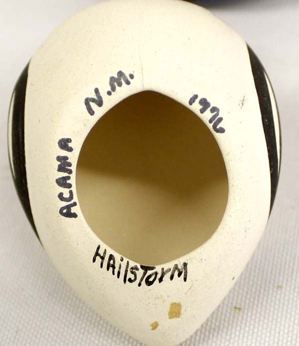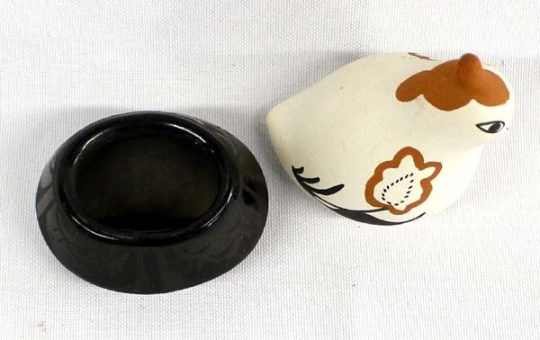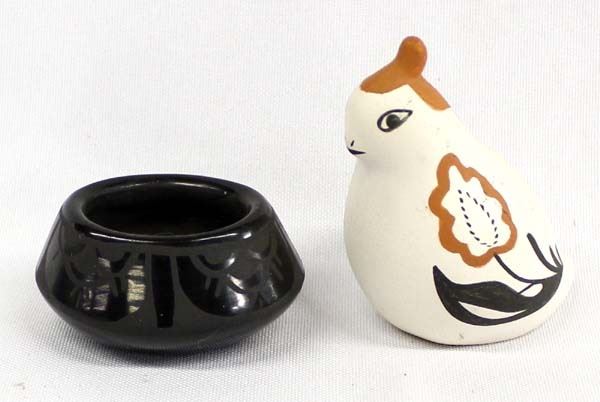 2 Native American Pottery Miniatures, includes 1. 1976 Acoma Painted Ceramic Quail by Hailstorm, measures 3'' x 2.75'' x 1.5'' and is signed on the bottom 2. Santa Clara Oval Bowl by Crescencia Tafoya (1918-1999), measures 2.25'' x 1.75'' x 1''H and is signed on the bottom, FYI: ''Crescencia Tafoya was the matriarch of a family of potters. Crescencia created a style of highly polished and tightly painted pottery which has been continued by her children. Crescencia won numerous awards for her pottery at Santa Fe Indian Market and other art events.''